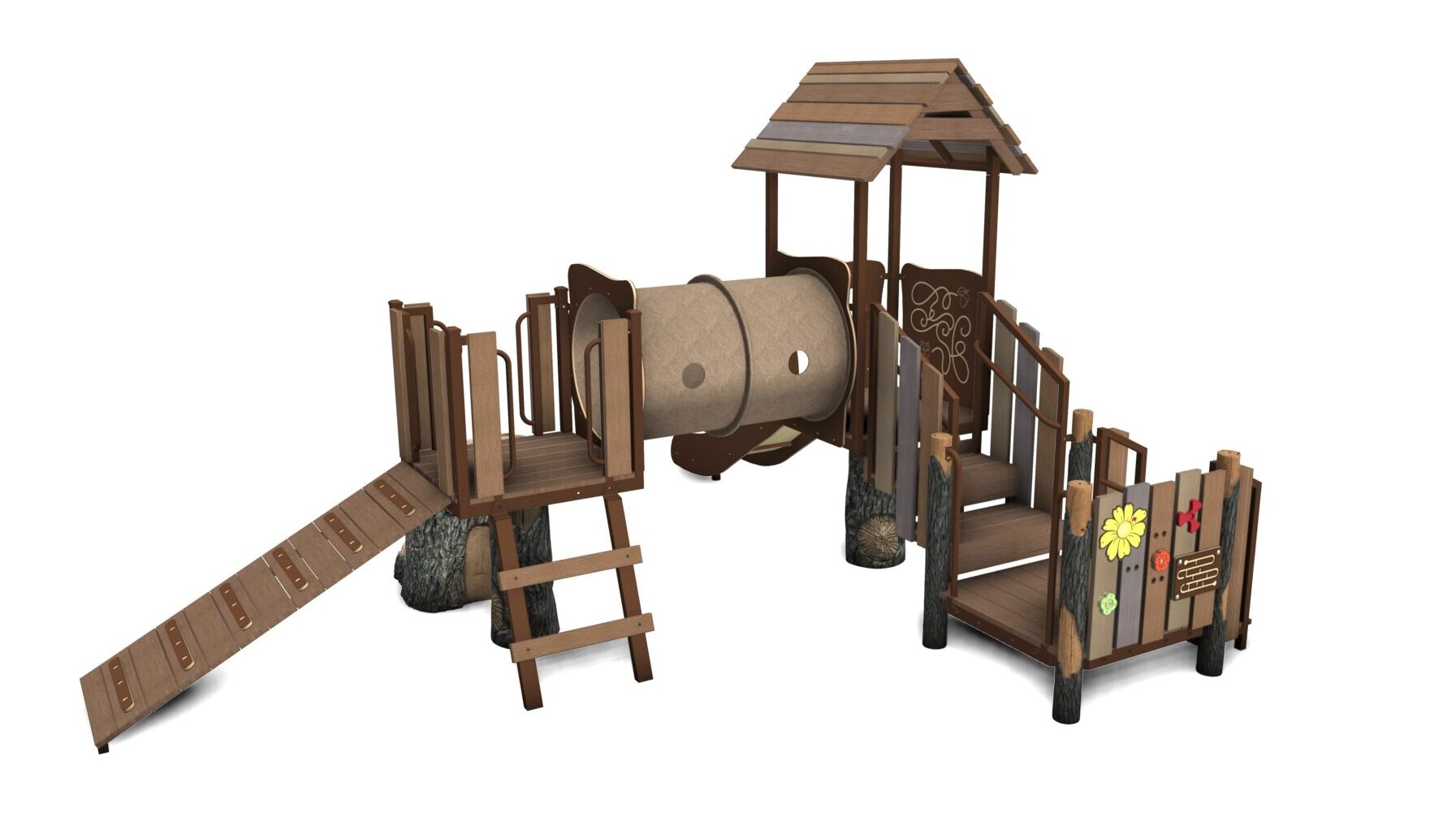 Acorn Adventure(age group: 2-5 yrs) is an educational and dynamic play system in our Deep Woods product line featuring an acorn maze panel, a plank play panel, accessible handholds, and more. Little explorers will access the play system via multiple climbers including the Plank Climber, the Tree Stump Climber, the Ladder Climber, or by steps.