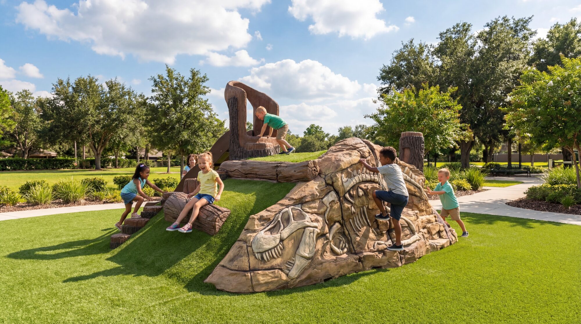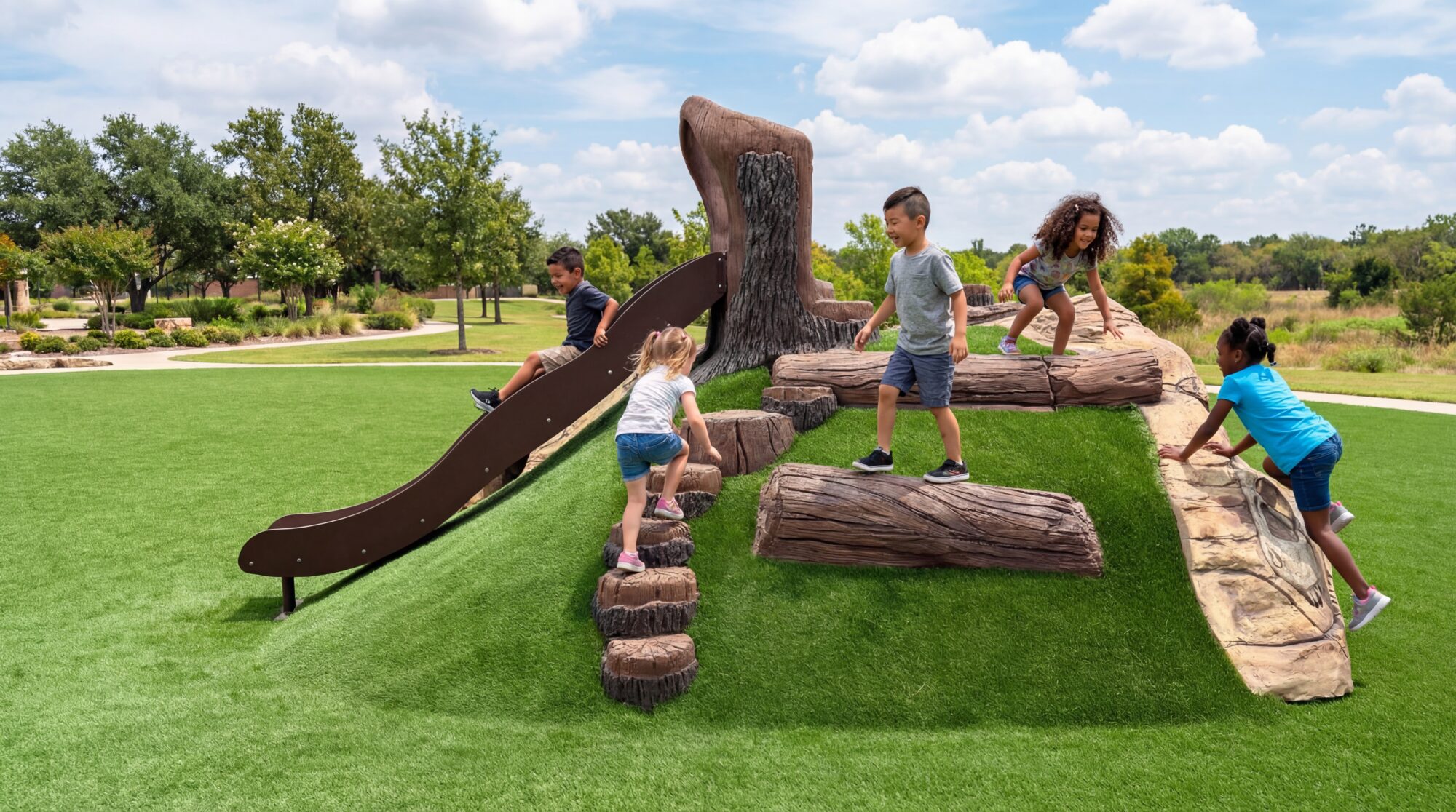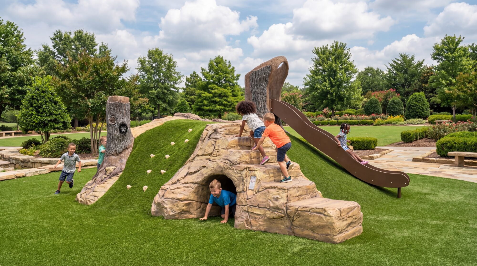 Jurassic Play Mound is a complete Play System with 360 degrees of dino-mite fun designed for adventure and exploration! Emerging paleontologists will study dinosaur fossils which also serve as handholds for climbing. Once at the top, young explorers will enjoy the Stream Slide made from High-Density Polyethylene (HDPE) for durability in the most severe temperatures, in either direction. Crawl through the rock tunnel and test your balance on logs and stump steppers made from our proprietary blend of Glass Fiber Reinforced Concrete for extreme durability.