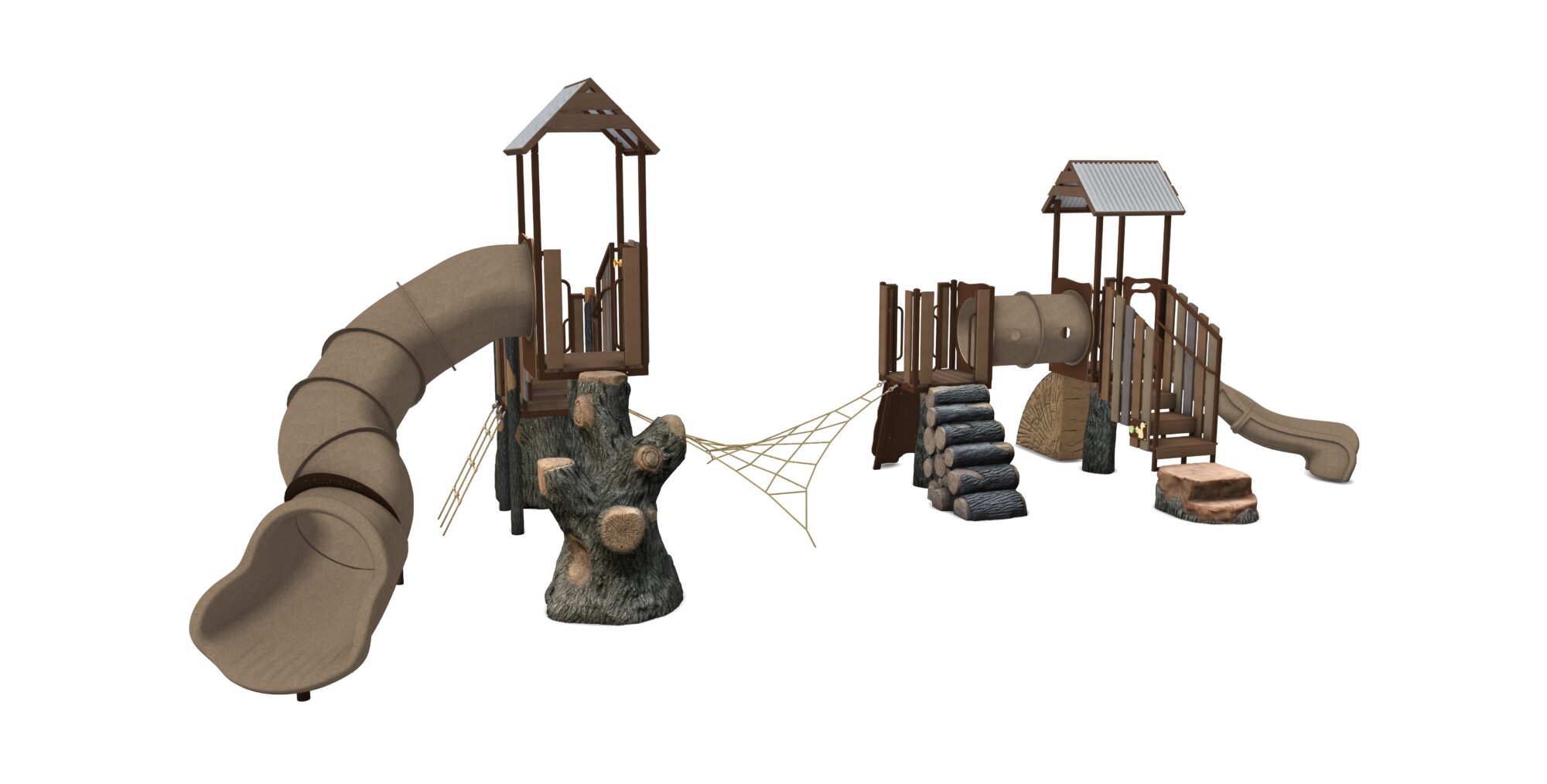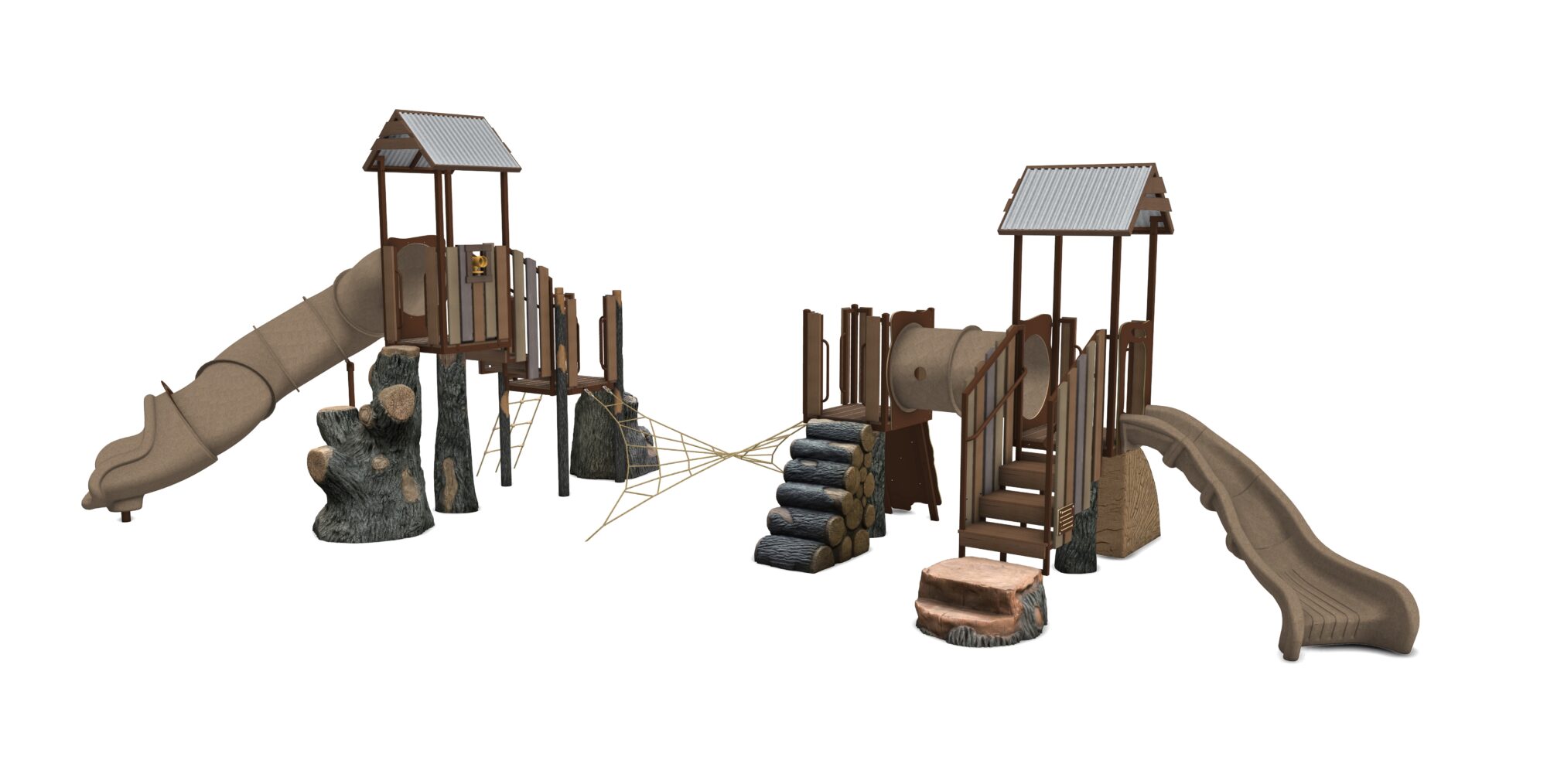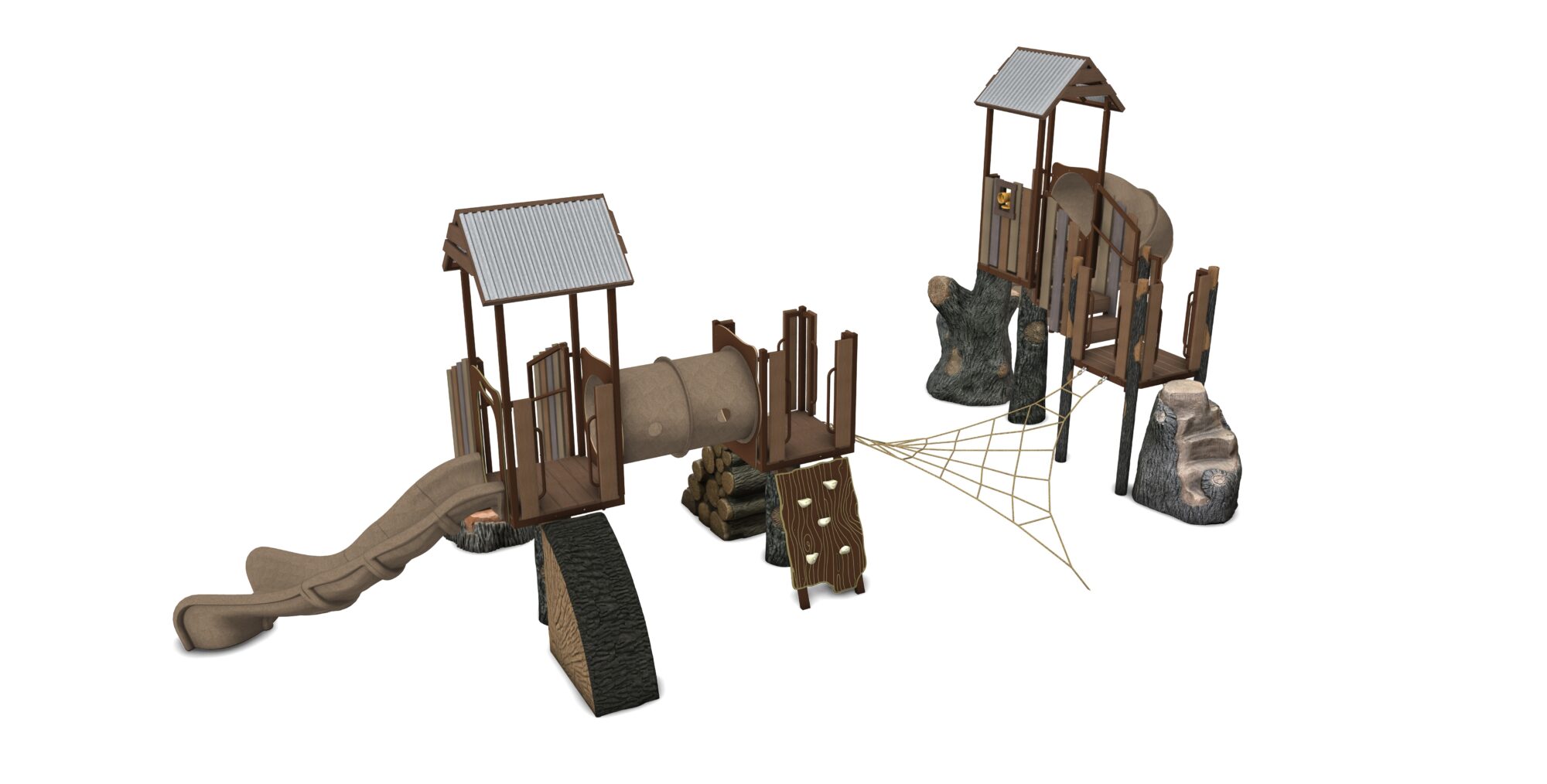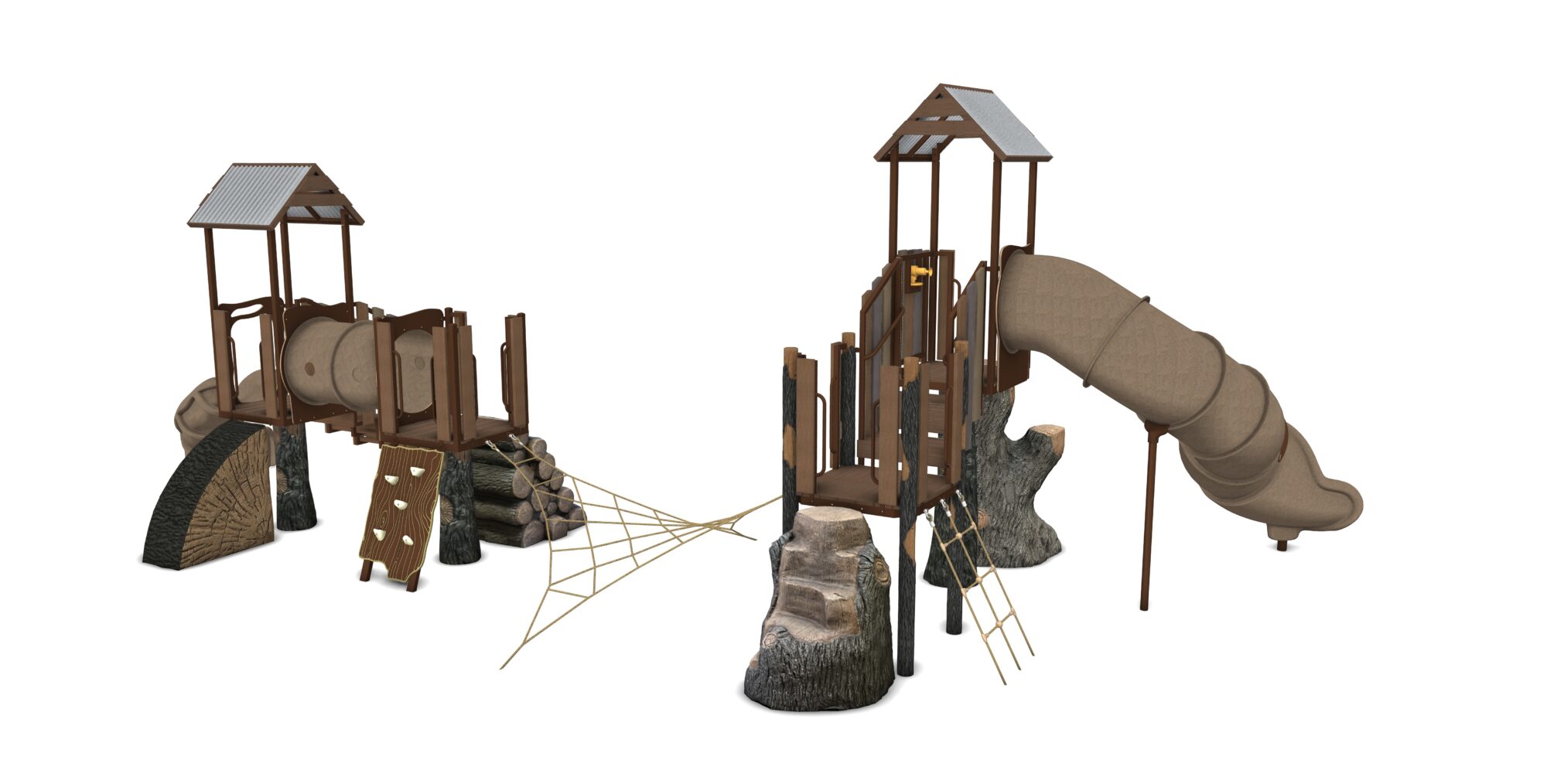 Resort Canyon is a complete play system in our Deep Woods product line featuring modular components including multiple access points and two unique play areas connected by the popular Four Points Net Climber. Change out components from our Deep Woods line of modular components for your personalized play system. Our materials are selected to withstand extreme conditions and our proprietary blend of glass-fiber reinforced concrete(GFRC) allows us to achieve an amazing look and feel.