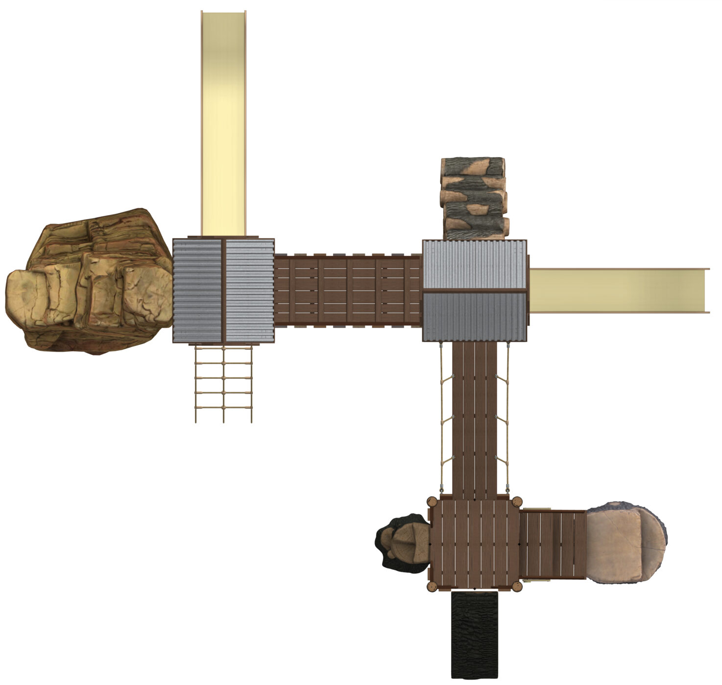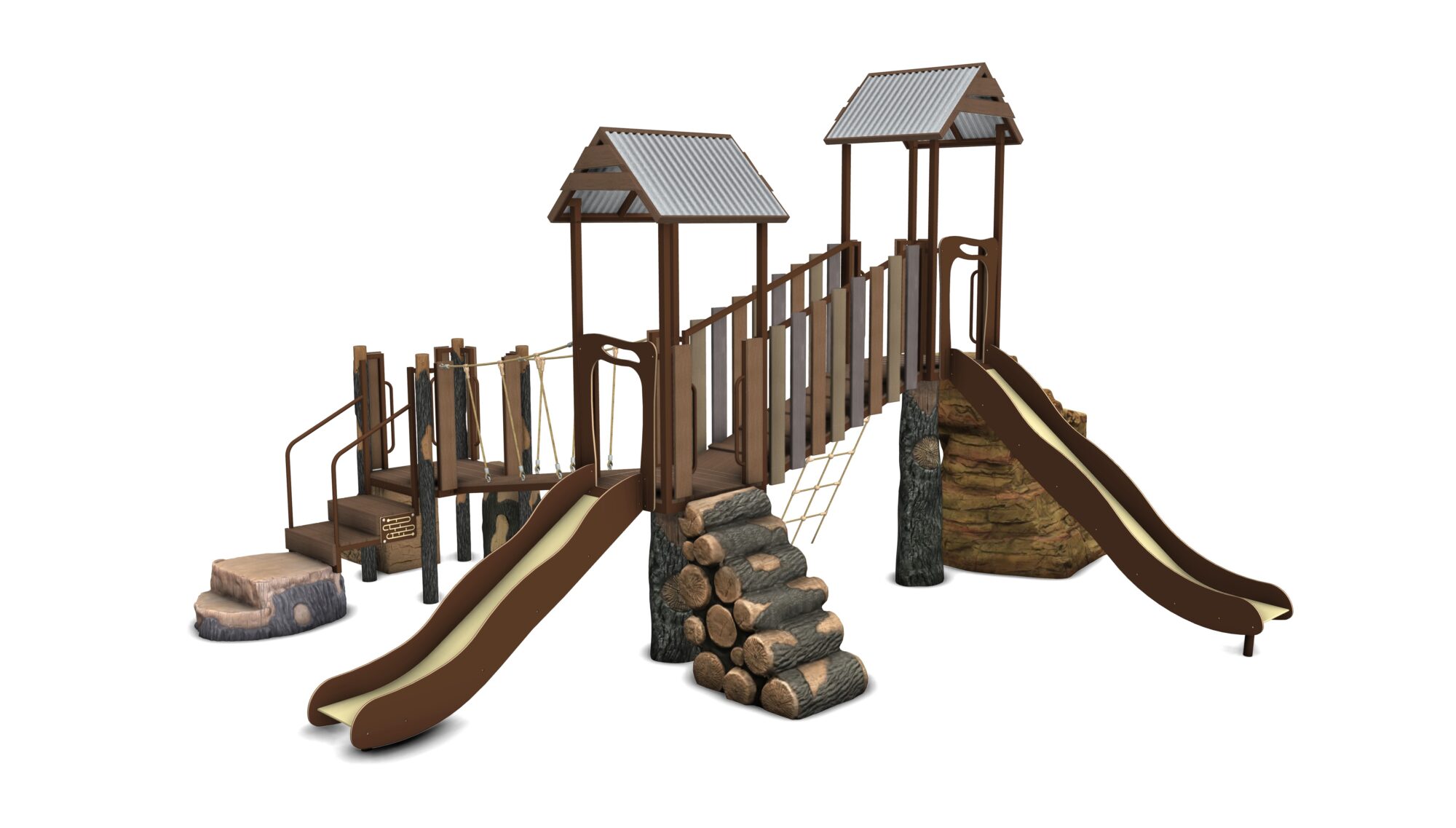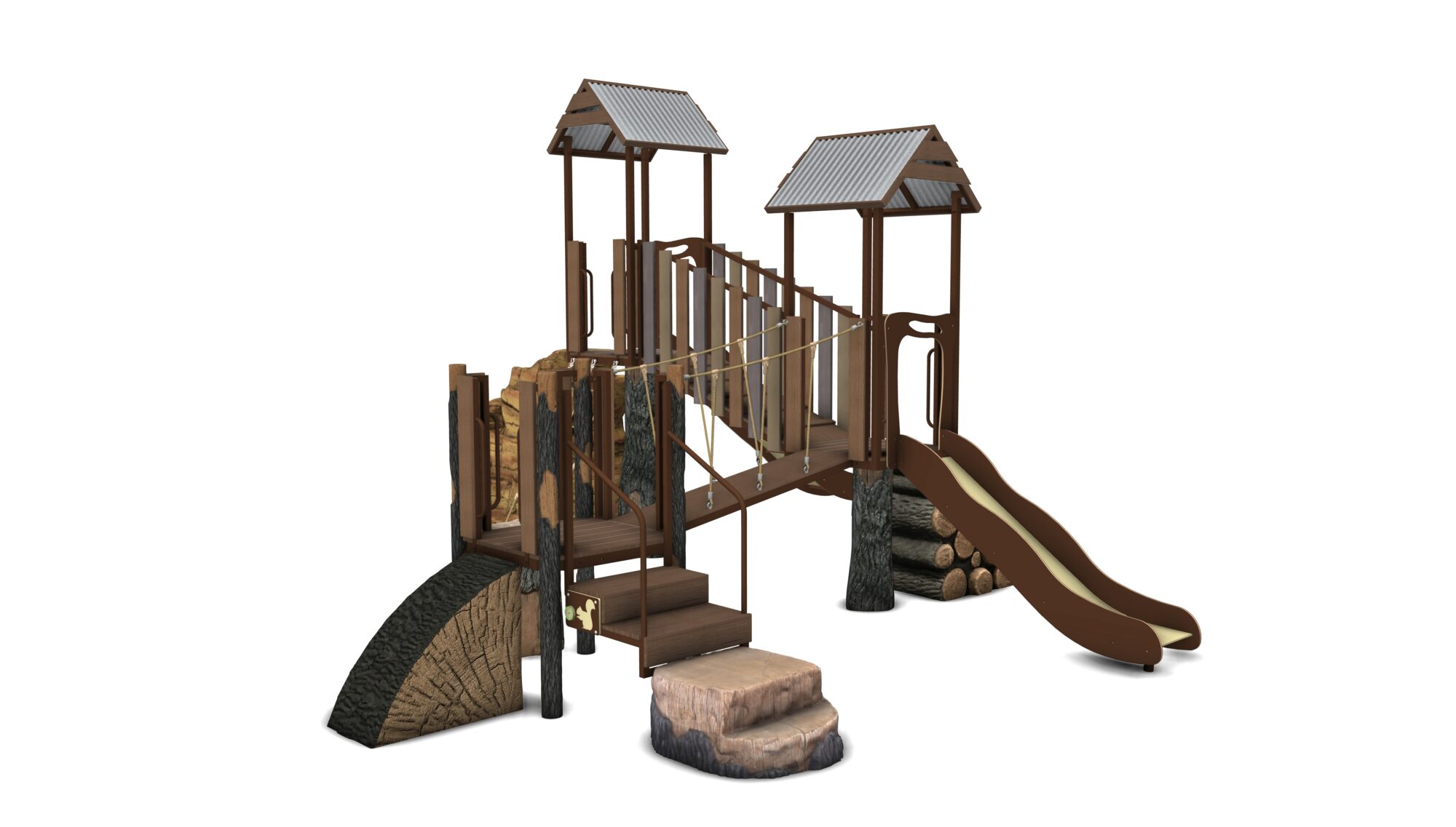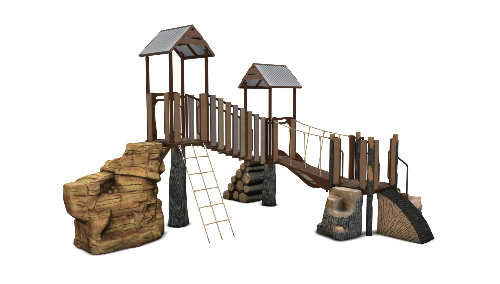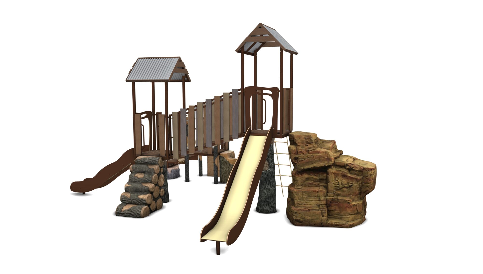 Shadow Lake is a complete play system in our Deep Woods product line featuring modular components including the Log Pile climber, Ledge Rock climber, Valley Crossing links, multiple slides and so much more! Our materials are selected to withstand extreme conditions and our proprietary blend of glass-fiber reinforced concrete(GFRC) allows us to achieve an amazing look and feel.