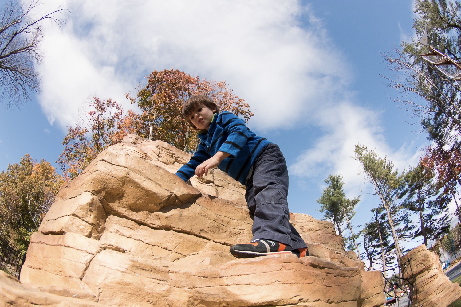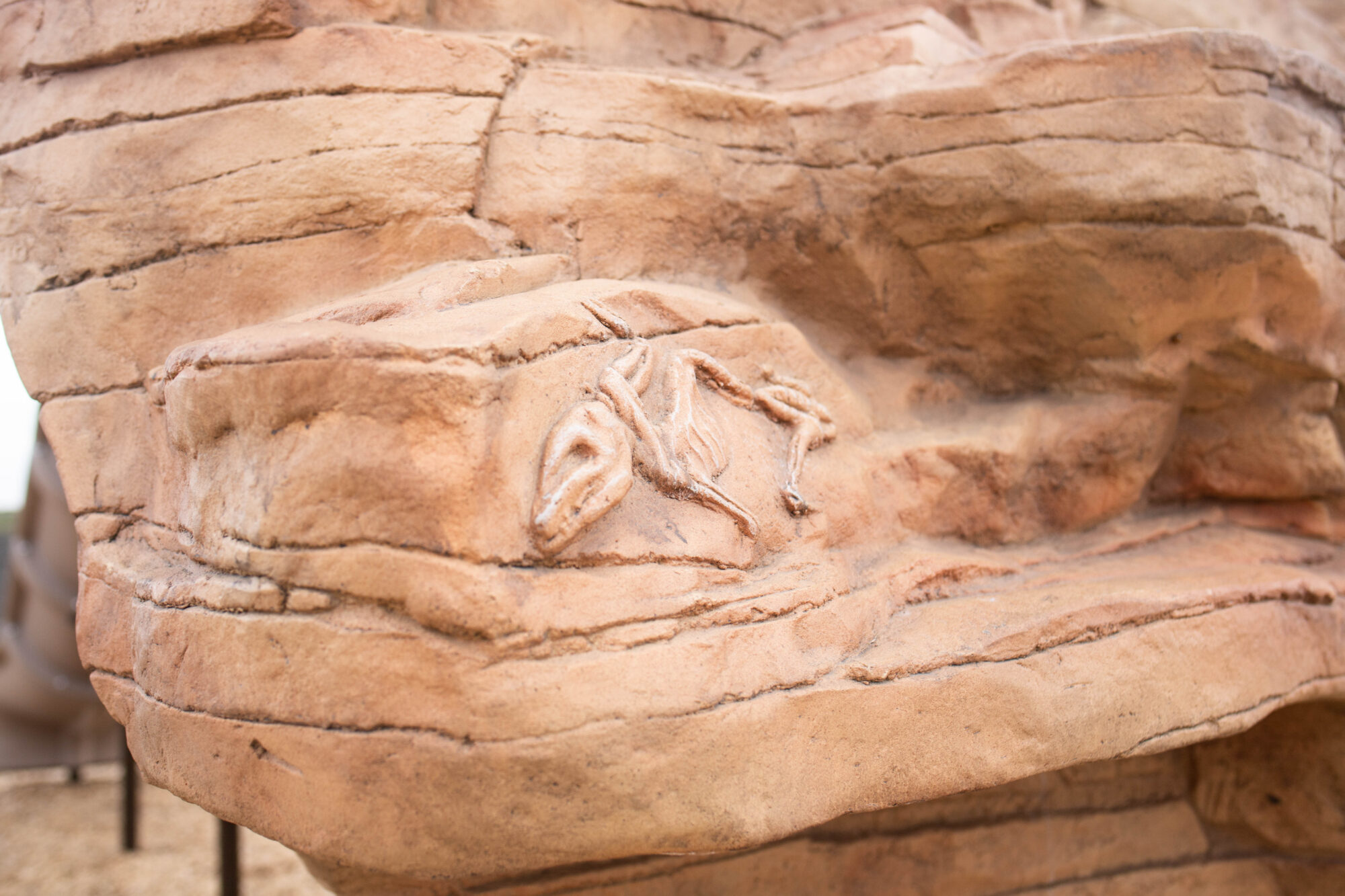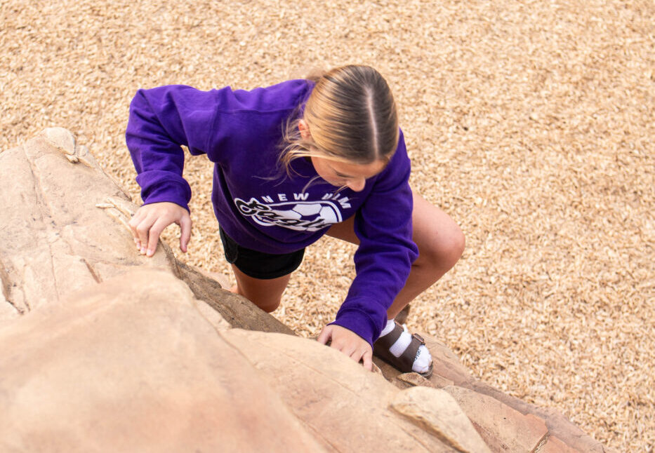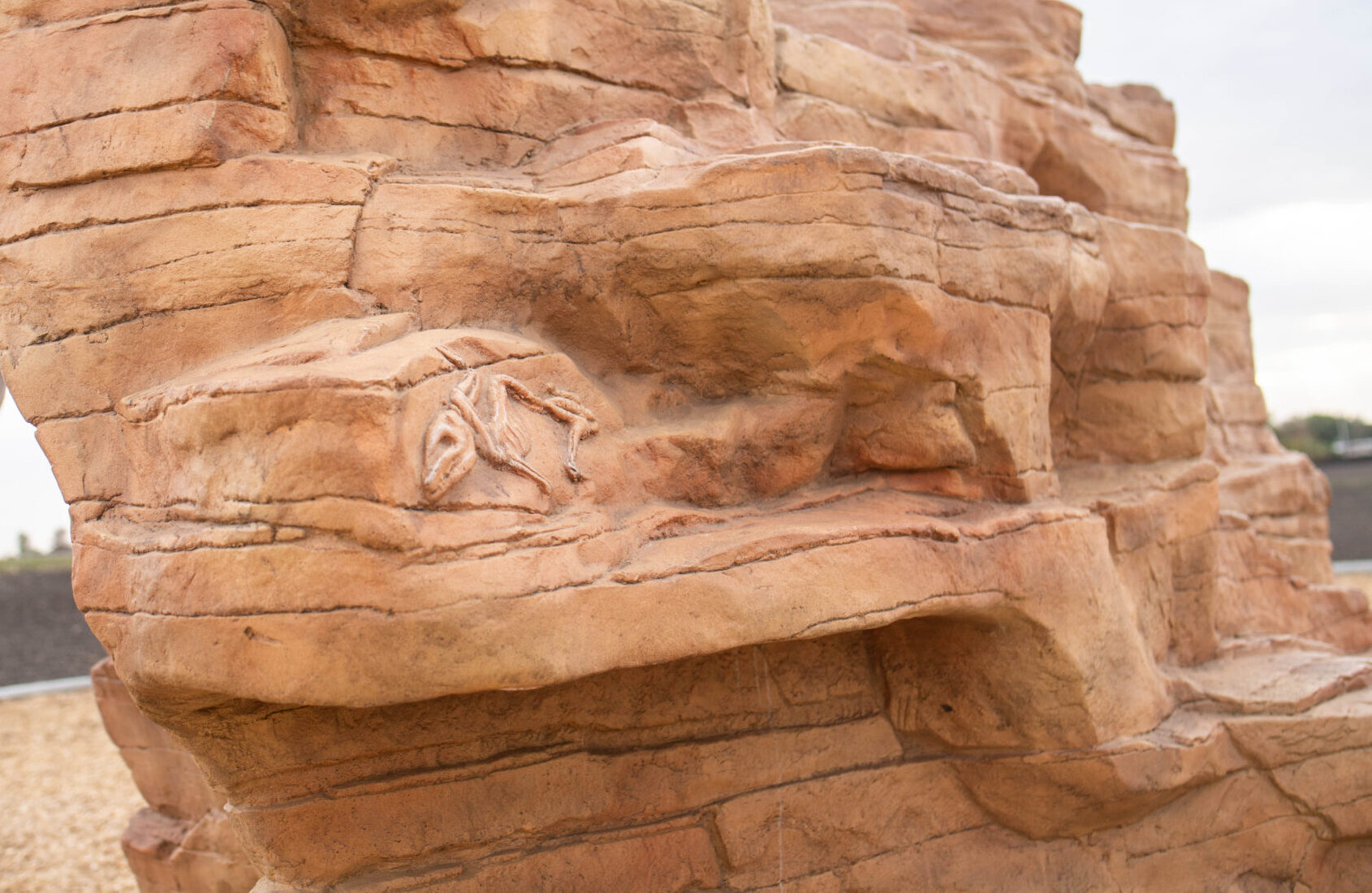 A realistic rock climber with varying degrees of climbing difficulties. Constructed of durable Glass Fiber Reinforced Concrete (GFRC). The unique design allows for 360 degrees of climbing, integrated handholds, realistic texture, fossil reliefs and a one of a kind ADA access for users of all abilities.