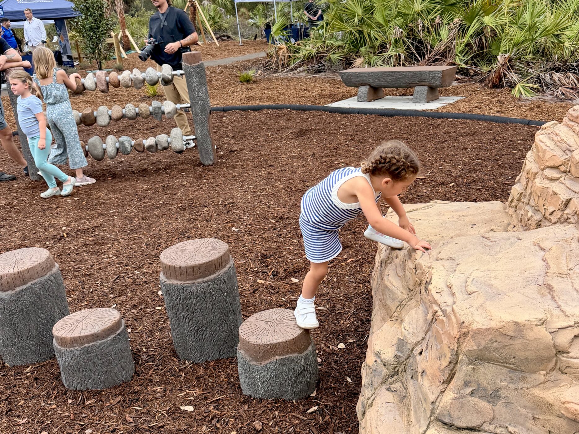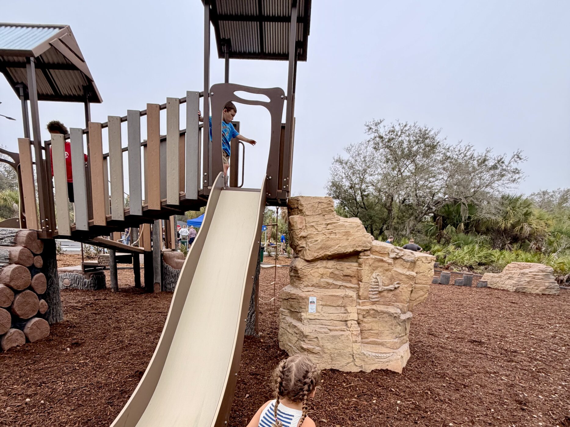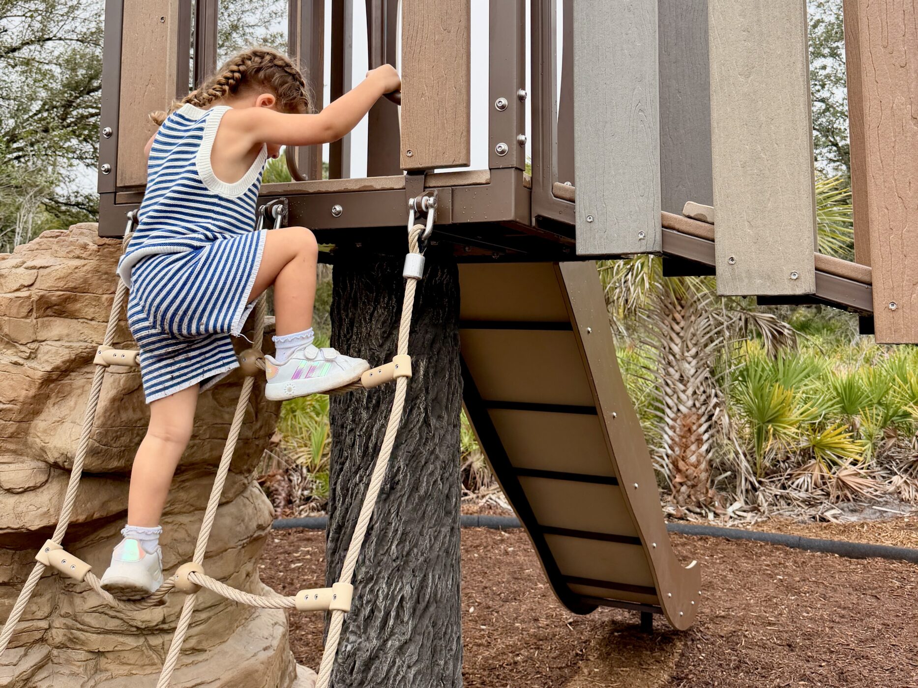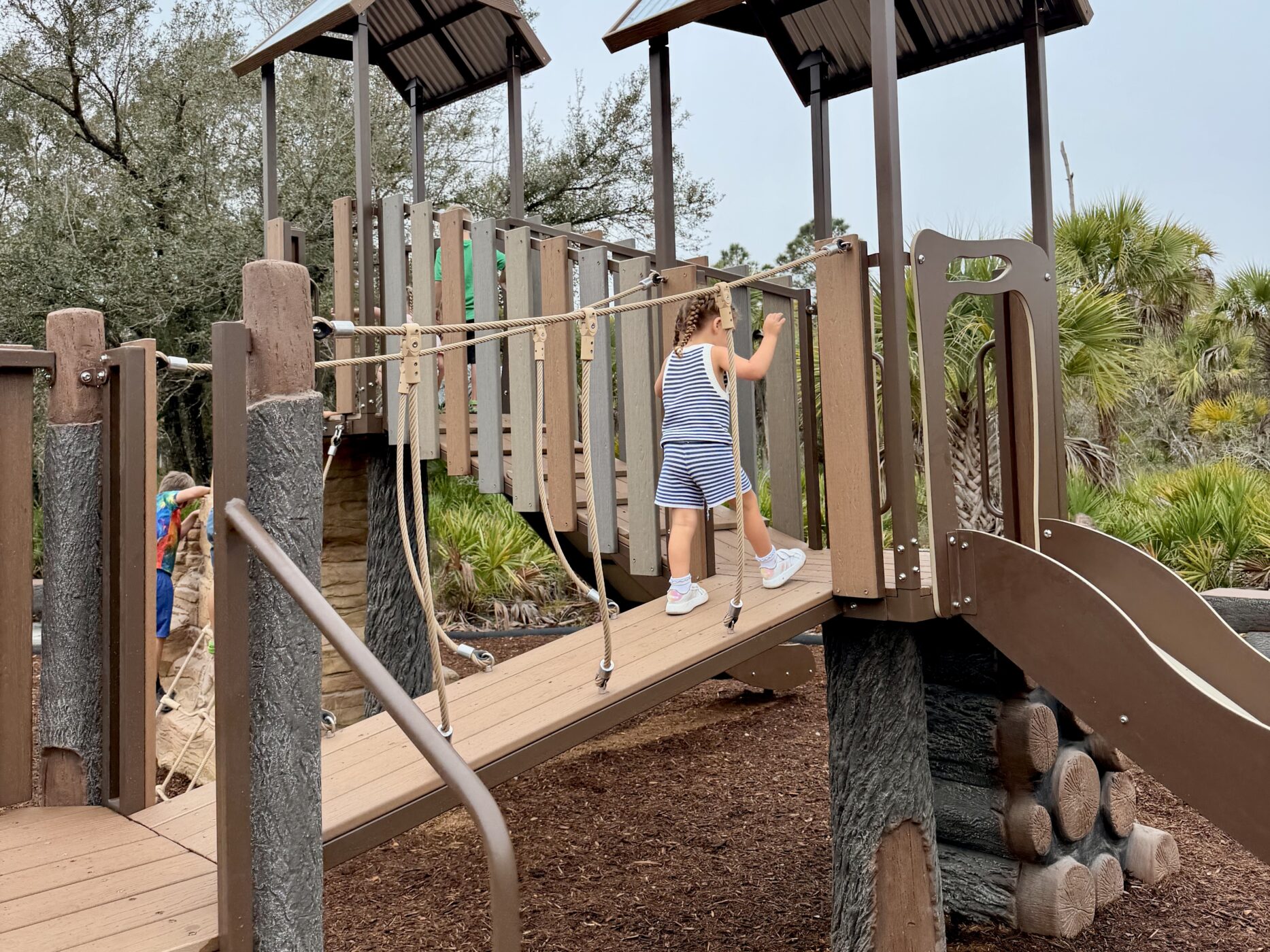 Boca Chica neighborhood park features multiple nature-themed playground products and systems to create a deep woods immersive experience for explorers, young and old. Although these play structures may look custom, they are all from our Product line– ready for play when you are! All climbers and play systems are made from materials selected for extreme durability. Included in this environment: