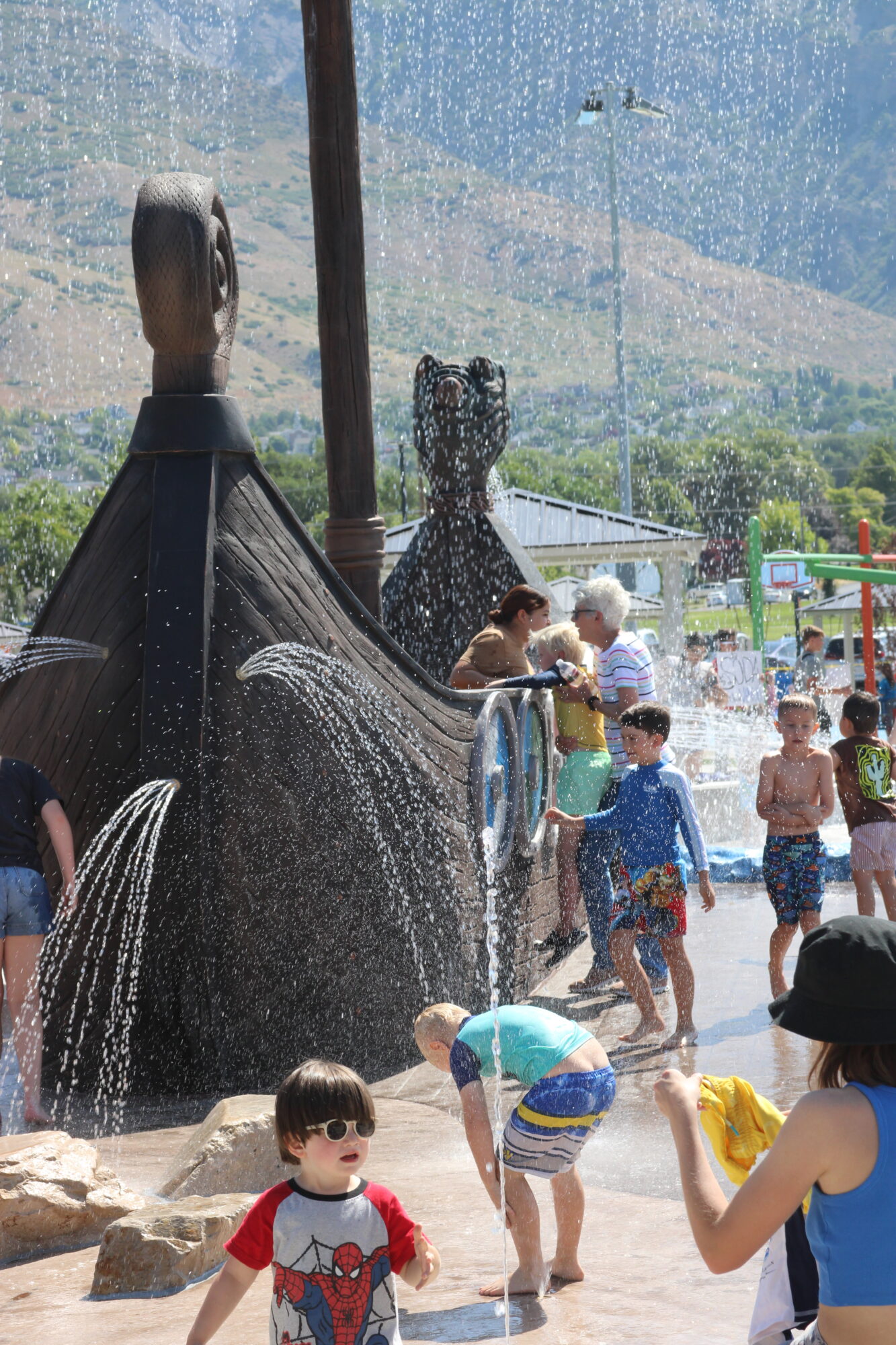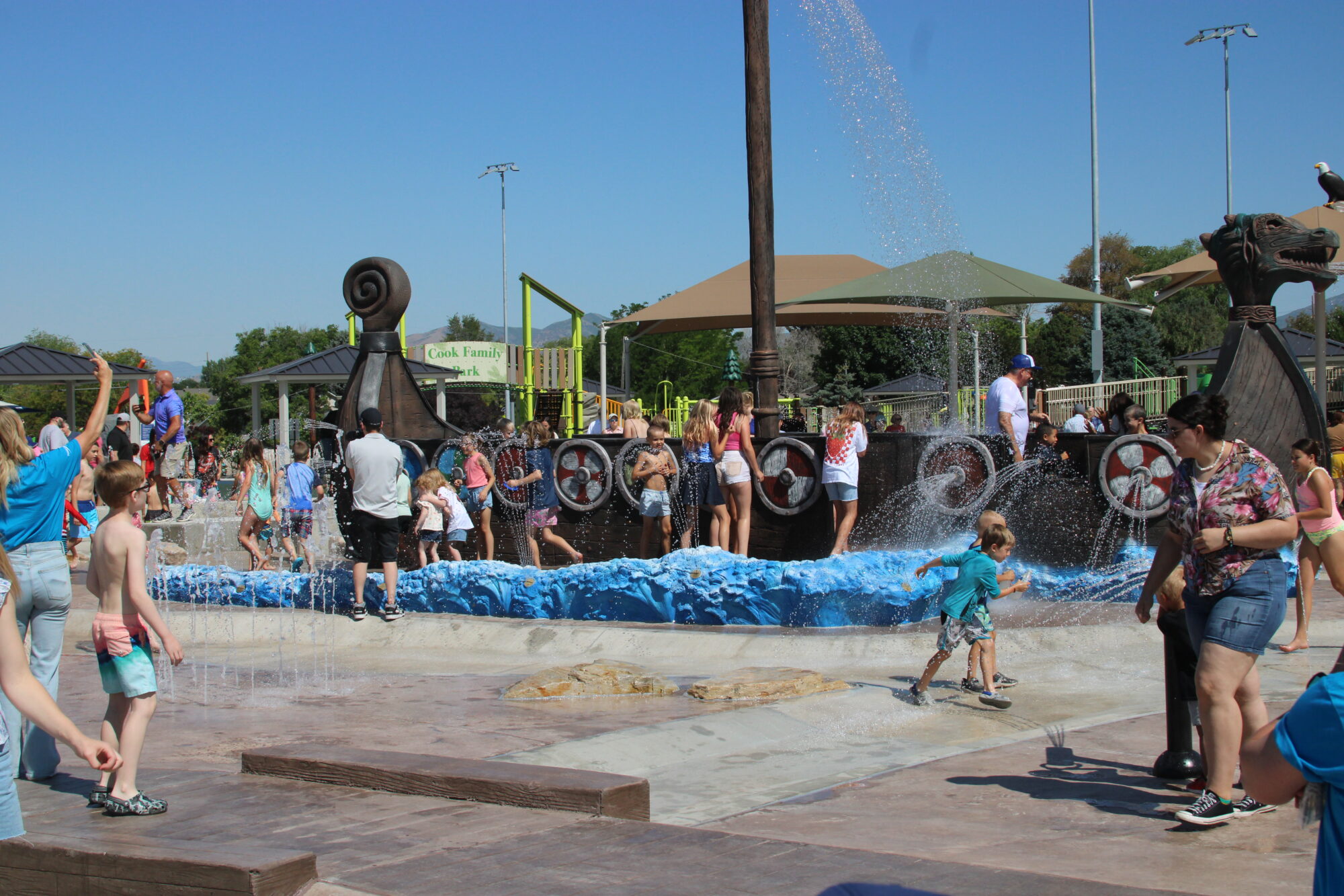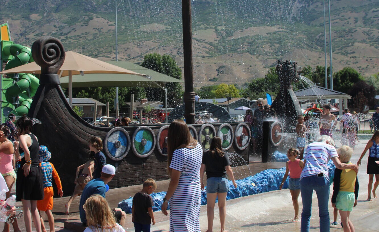 The lil’ pioneers of Pleasant Grove, Utah, navigate the waters on an inclusive 34-foot adventure-filled Viking Ship. Kids and adults enter the ship from several entry points, including one that is wheelchair accessible. Water sprays from the shields on the side of the ship as well as drops from the mast, creating the effect of a sail. Kids control cannons spraying water from the sides of the ship as they sail the seas of a 10,000-square-foot splash pad.