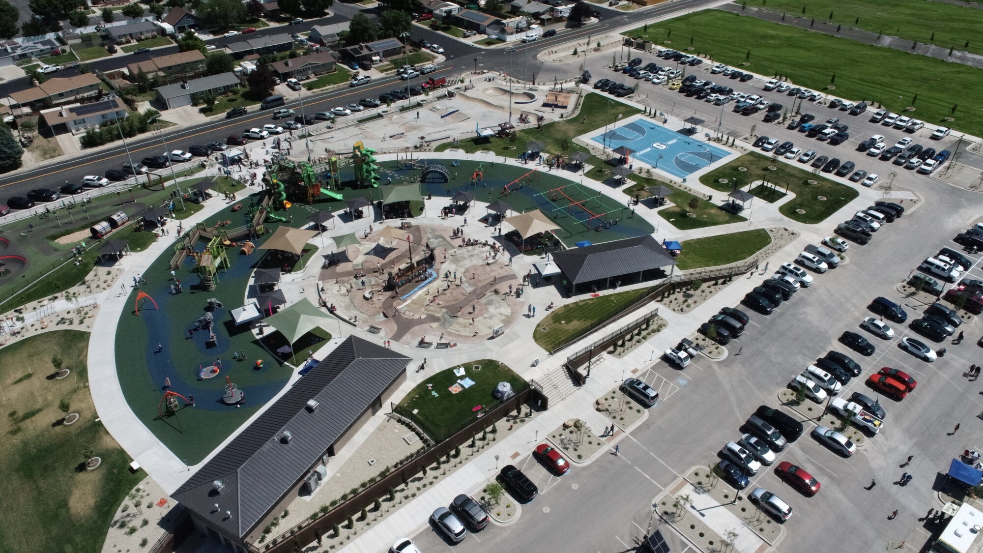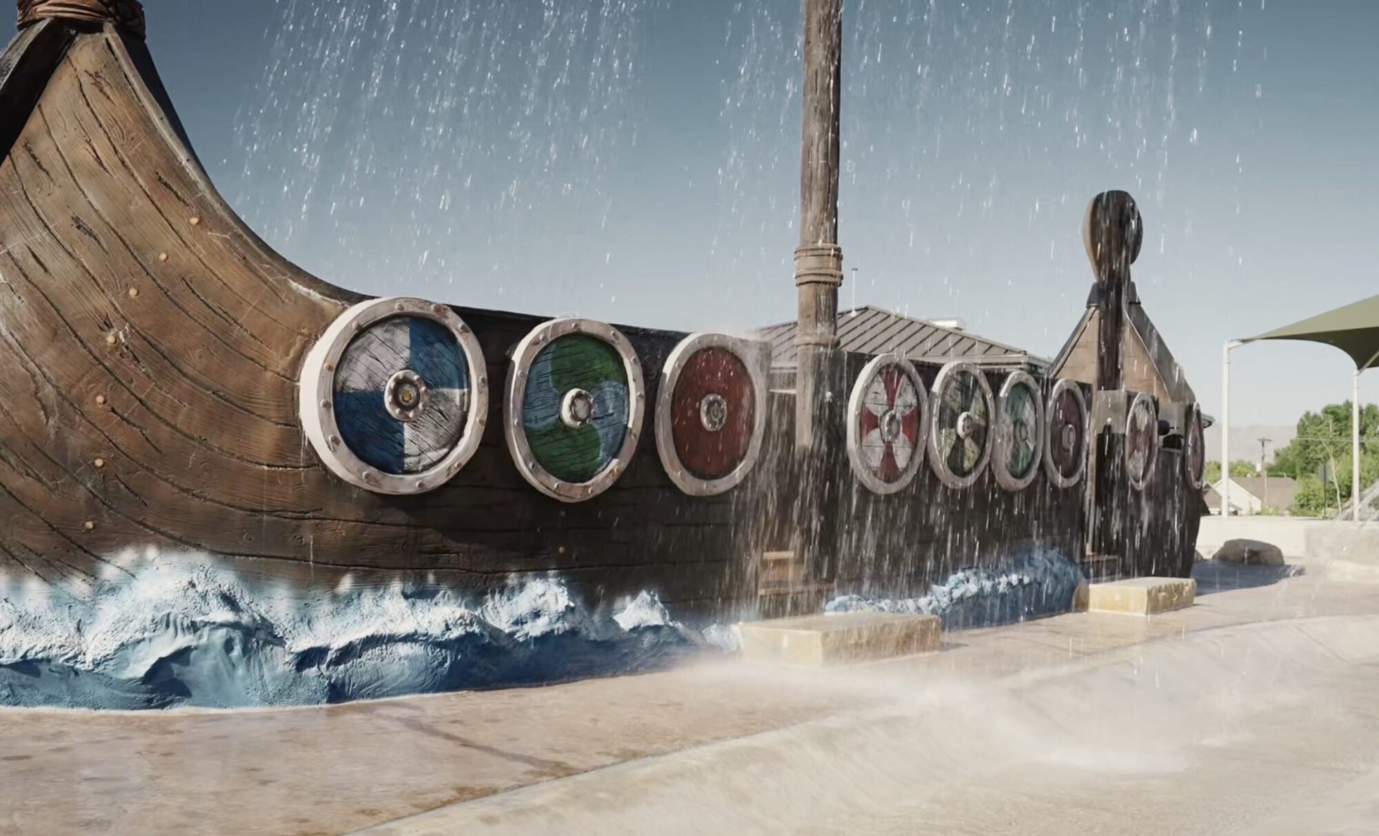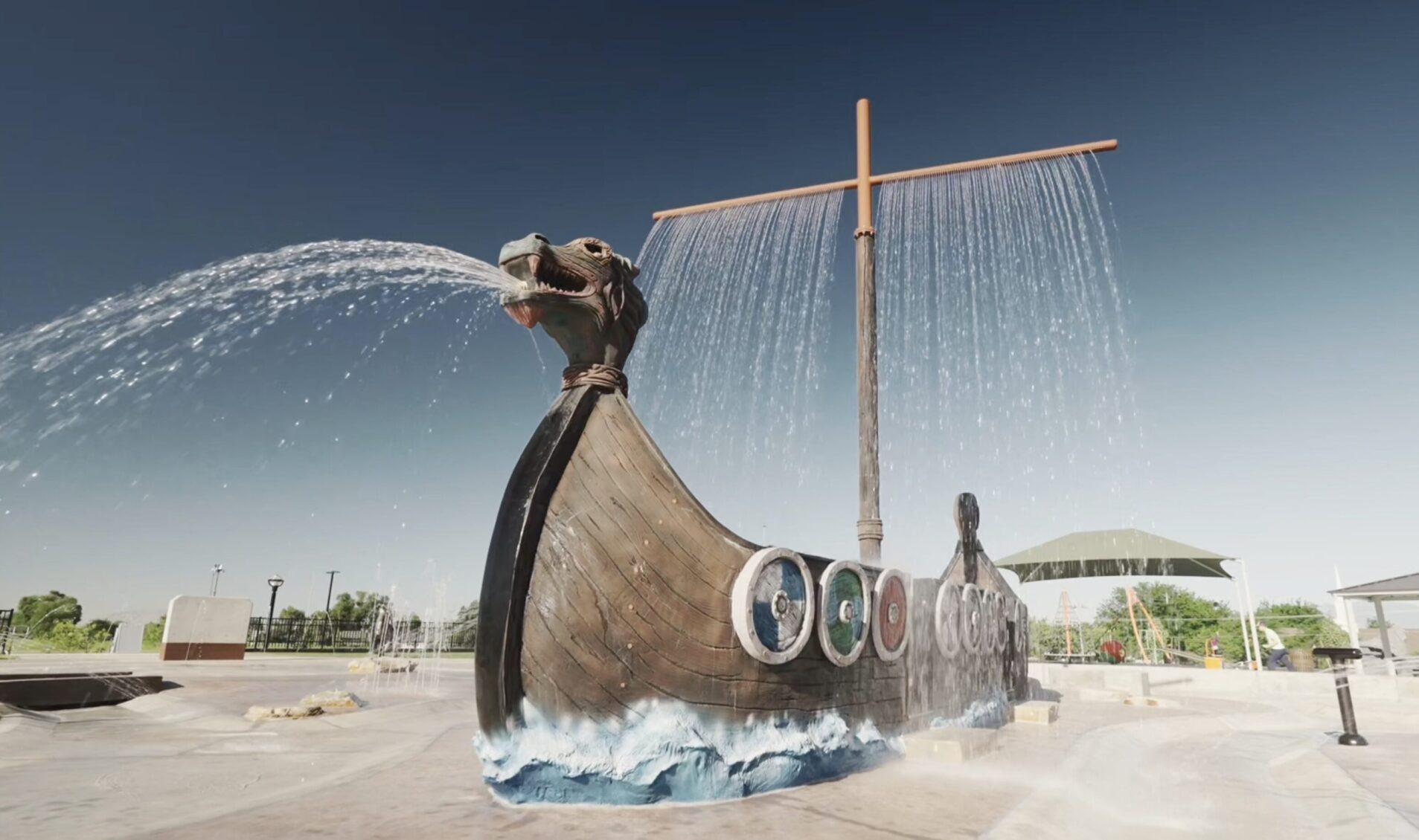 The lil’ pioneers of Pleasant Grove, Utah, navigate the waters on an inclusive 34-foot adventure-filled Viking Ship. Kids and adults enter the ship from several entry points, including one that is wheelchair accessible. Water sprays from the shields on the side of the ship as well as drops from the mast, creating the effect of a sail. Kids control cannons spraying water from the sides of the ship as they sail the seas of a 10,000-square-foot splash pad.
