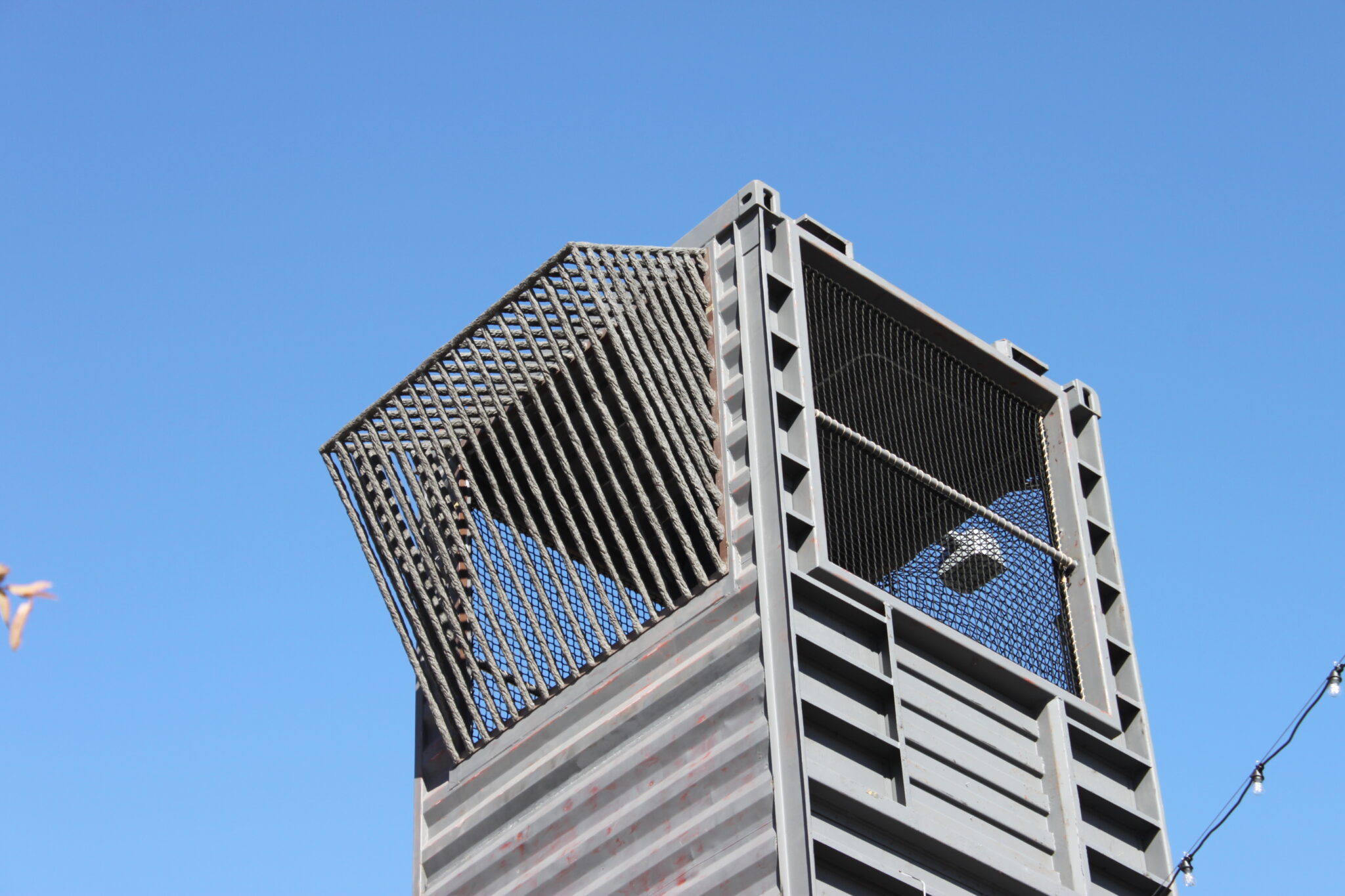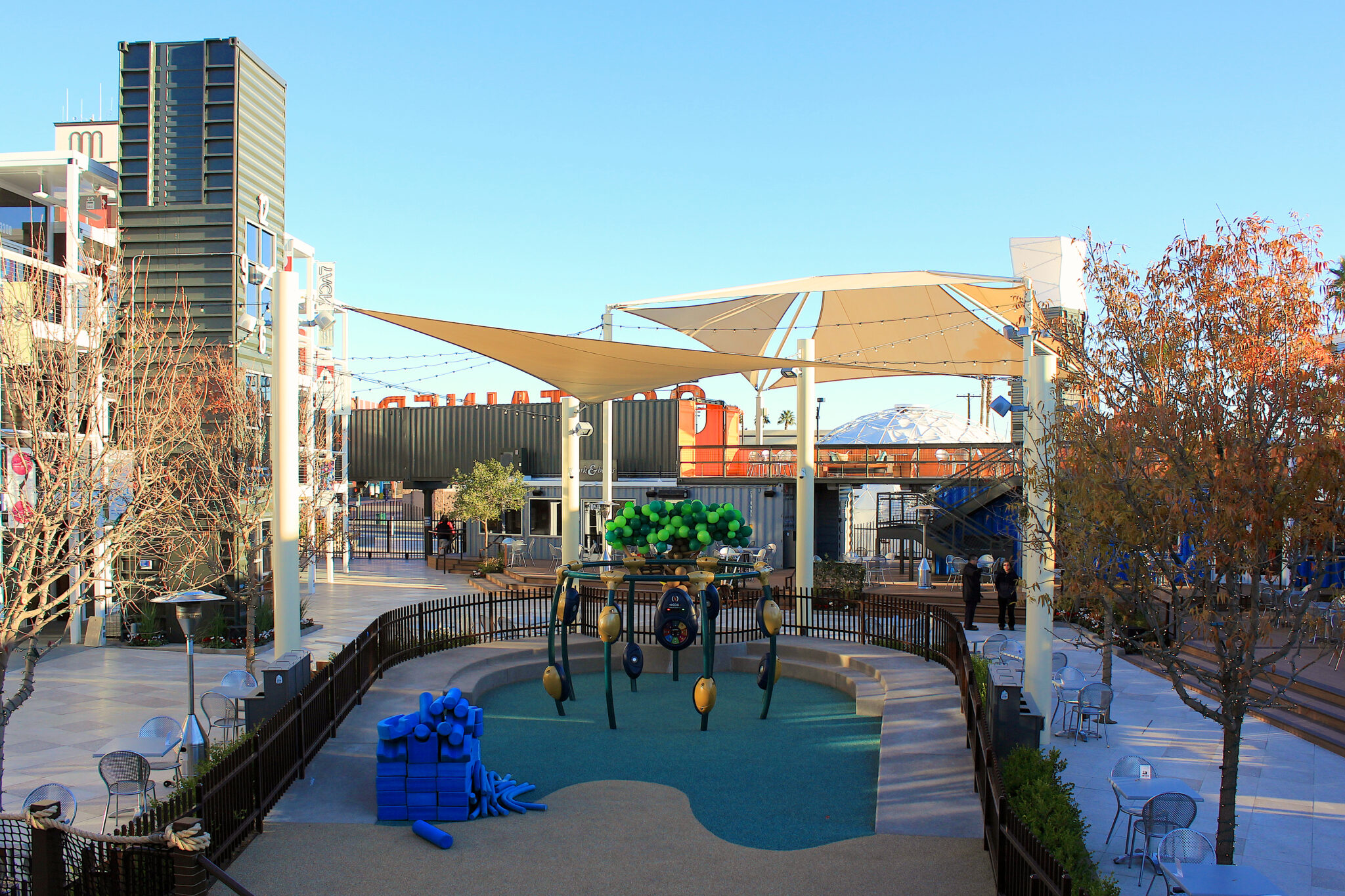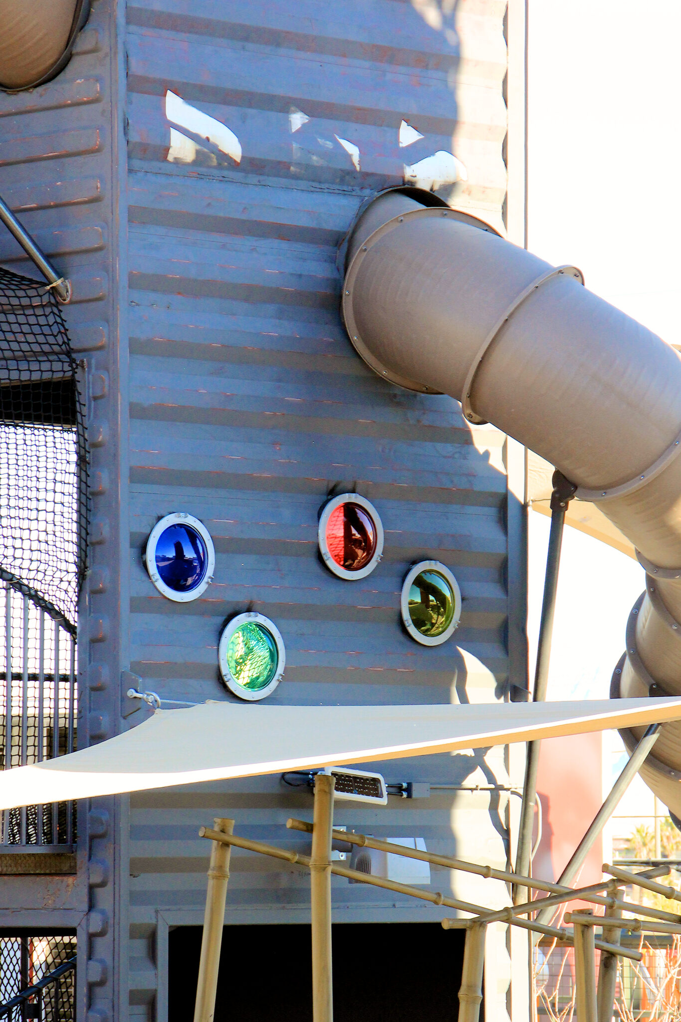 Located on Fremont Street in downtown Las Vegas, Container Park hosts small local shops, eateries and community-focused activities for the families of Las Vegas. When we were asked to design and build an interactive play exhibit for the park our answer was obvious… “We’re All-In!” Local businesses border the park and operate from repurposed shipping containers. Naturally, the play exhibit which would be located in the center of the park needed to incorporate shipping containers as well. The concept is Swiss Family Robinson treehouse meets urban art. This is an all-ages park- kids and adults can climb to the top of a 40’ high container that stands end-on-end and lean against a 30 degree look-out window for a view of the entire park. Energy-savings sensors in the tube slide are triggered to activate cosmic, starship, hyper-drive and fish tank visual displays as well as a sonic boom and blast of air. Take the wonky bridge to the ‘living tree’ which has a concrete trunk with real live vegetation at the top! Other elements include the wind spinner art exhibit and a treasure hunt that will send kids and adults on an adventure!