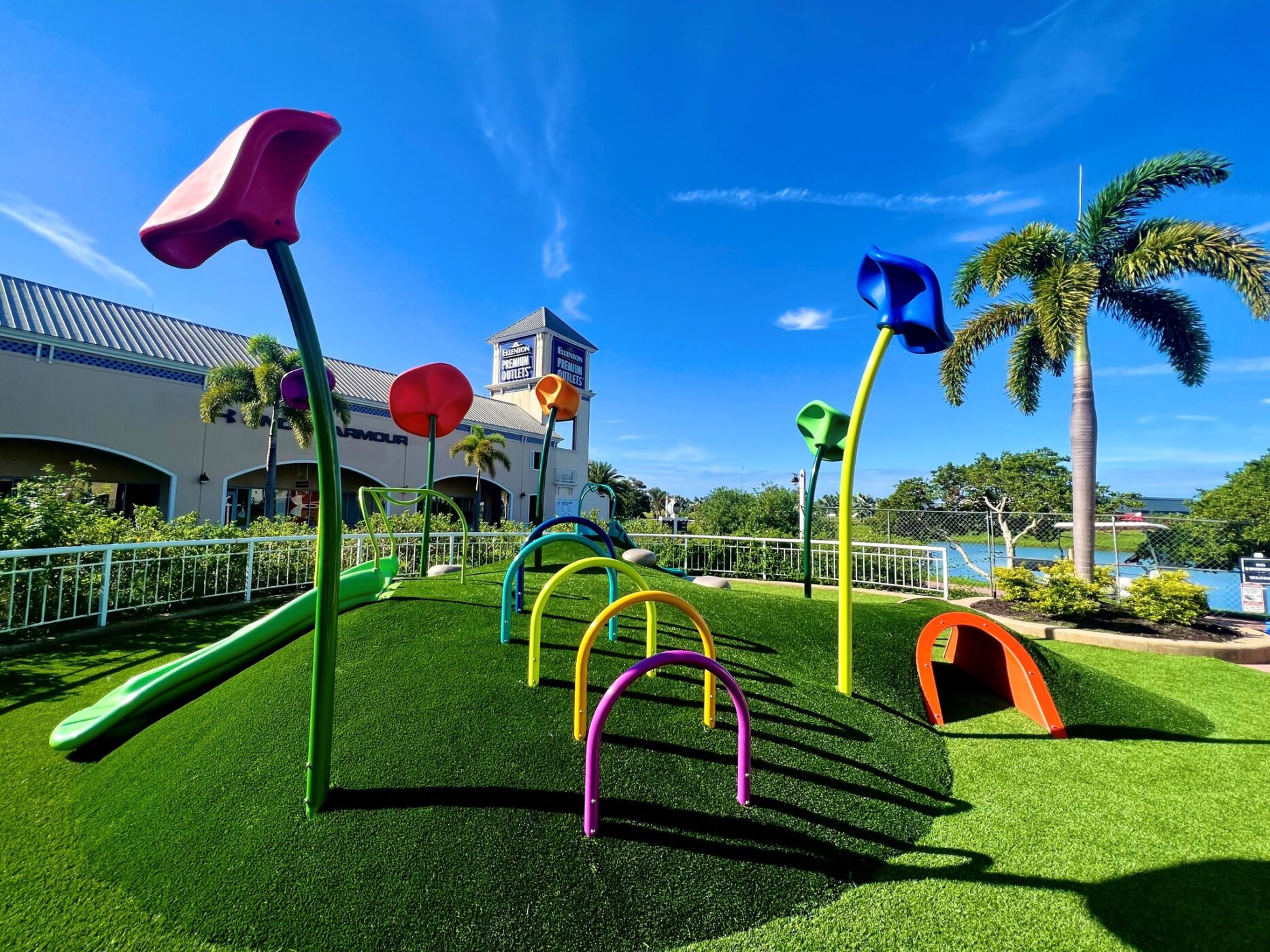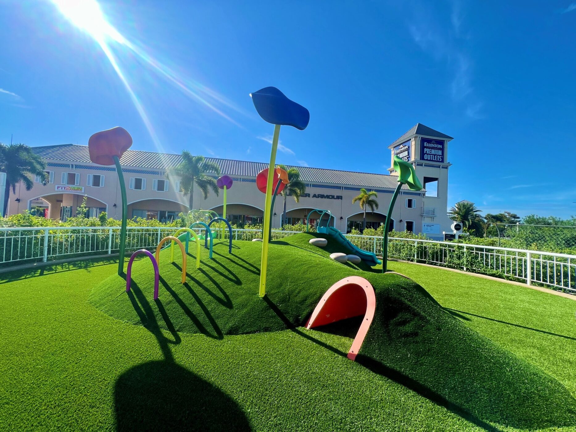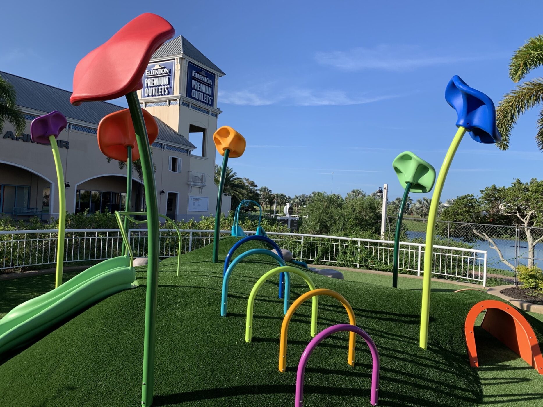 The Ellenton Premium Outlets play environment in Ellenton, Florida features rolling landforms which provide active and challenging fun for all! It is the perfect break for kids while parents shop! Bursting with color, this play space features the Crawl Mound, climbing elements, slides and more!