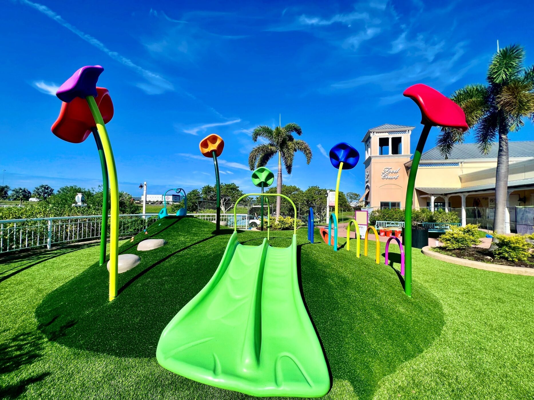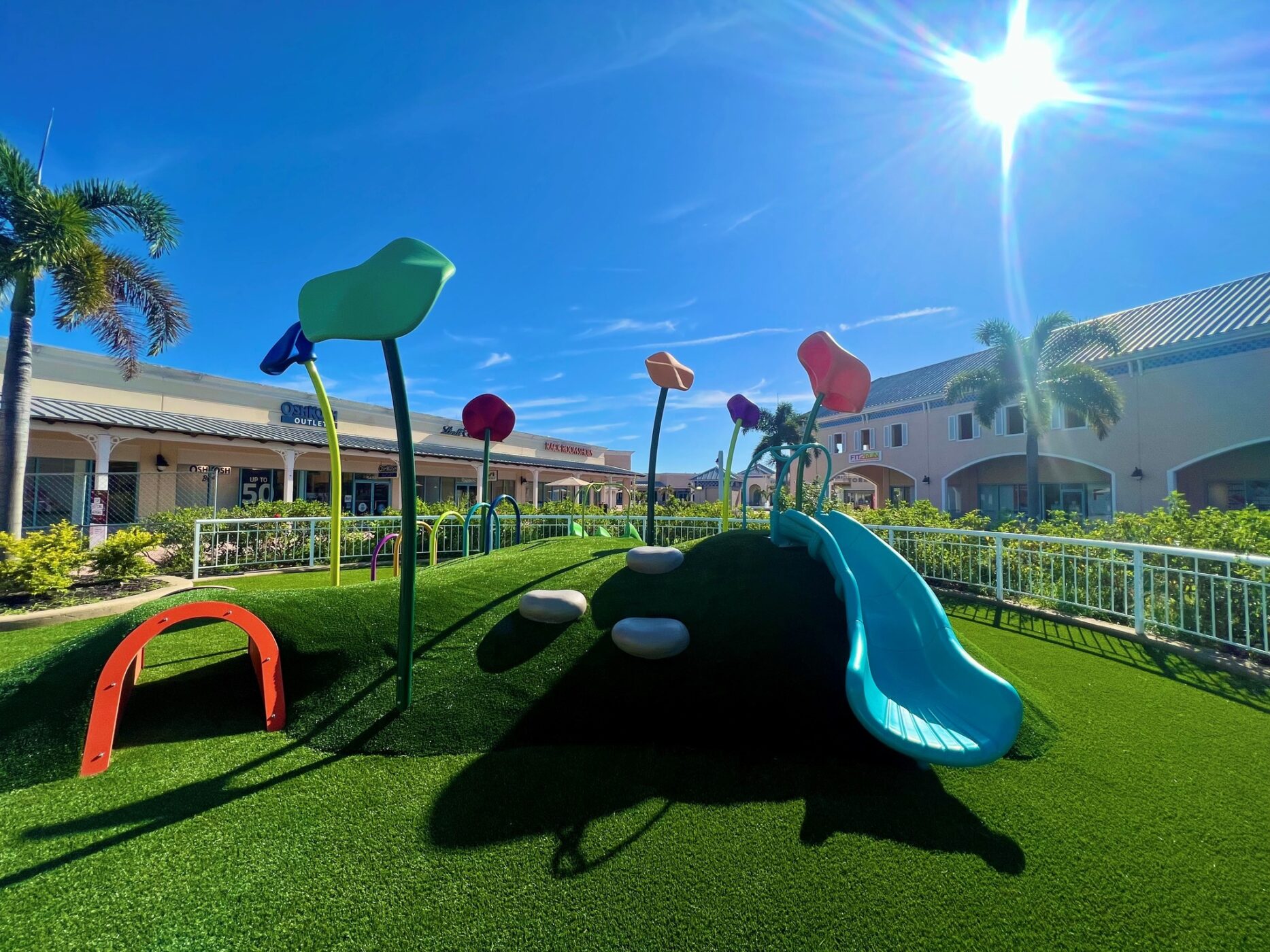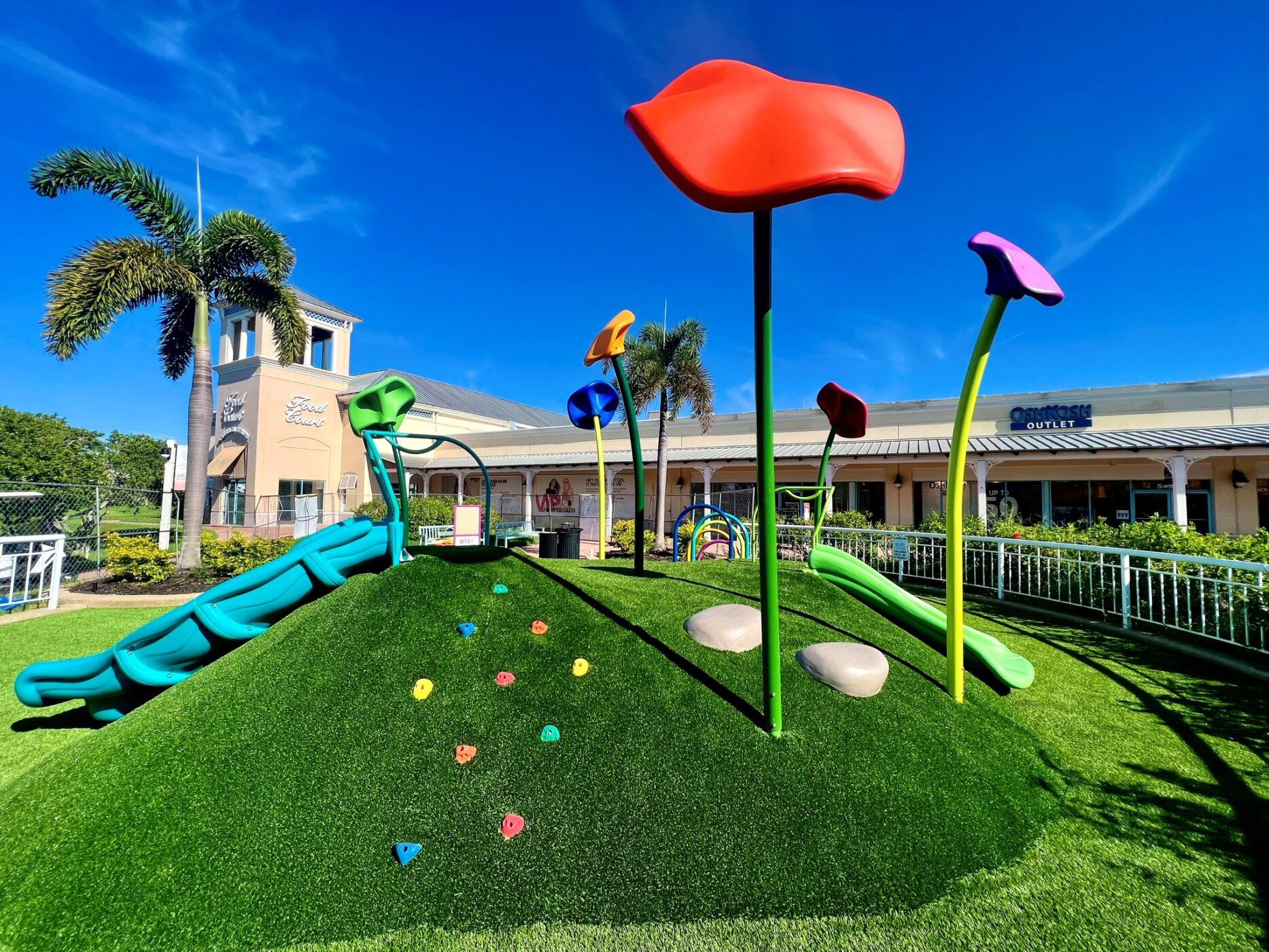 The Ellenton Premium Outlets play environment in Ellenton, Florida features rolling landforms which provide active and challenging fun for all! It is the perfect break for kids while parents shop! Bursting with color, this play space features the Crawl Mound, climbing elements, slides and more!