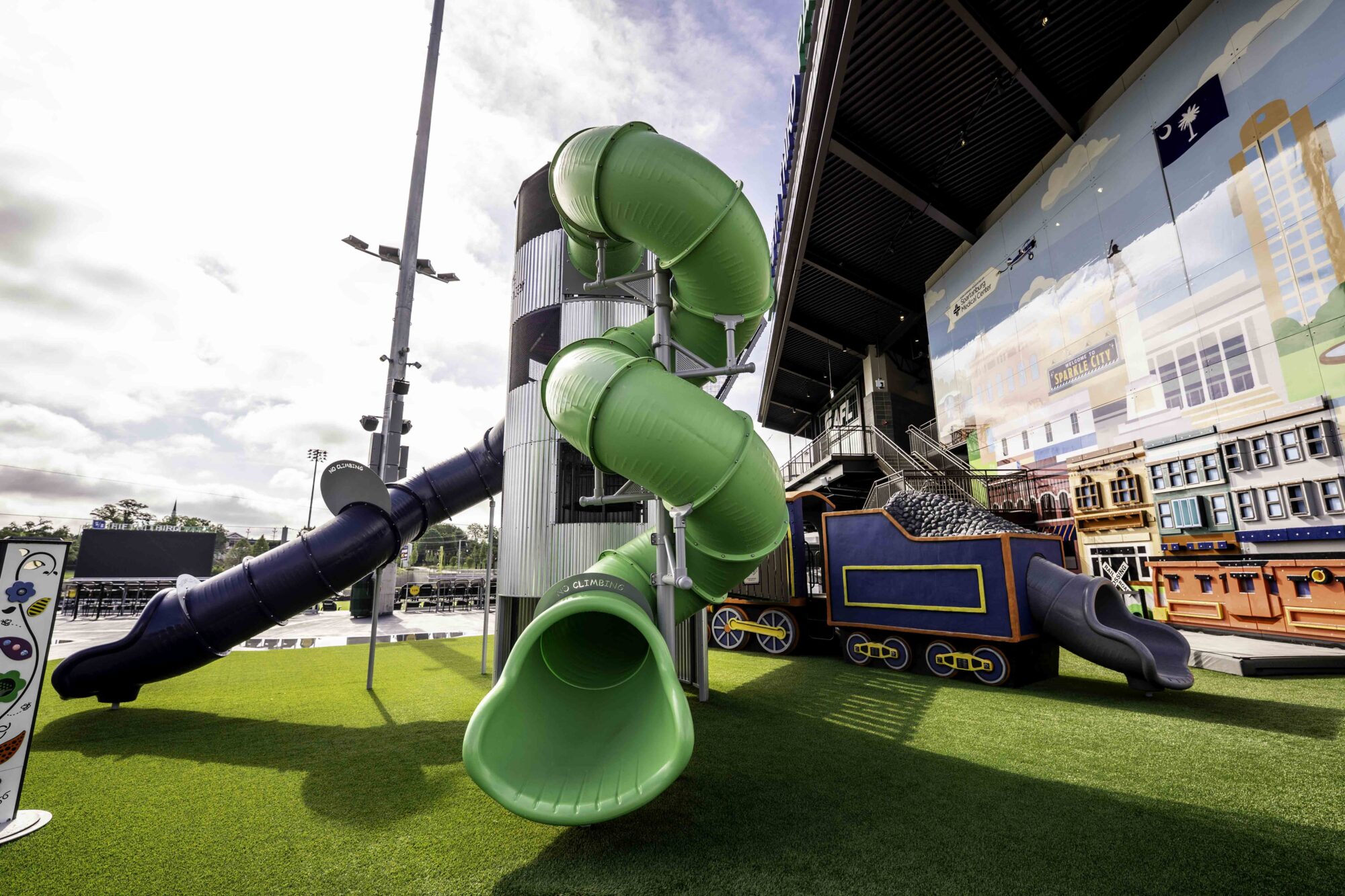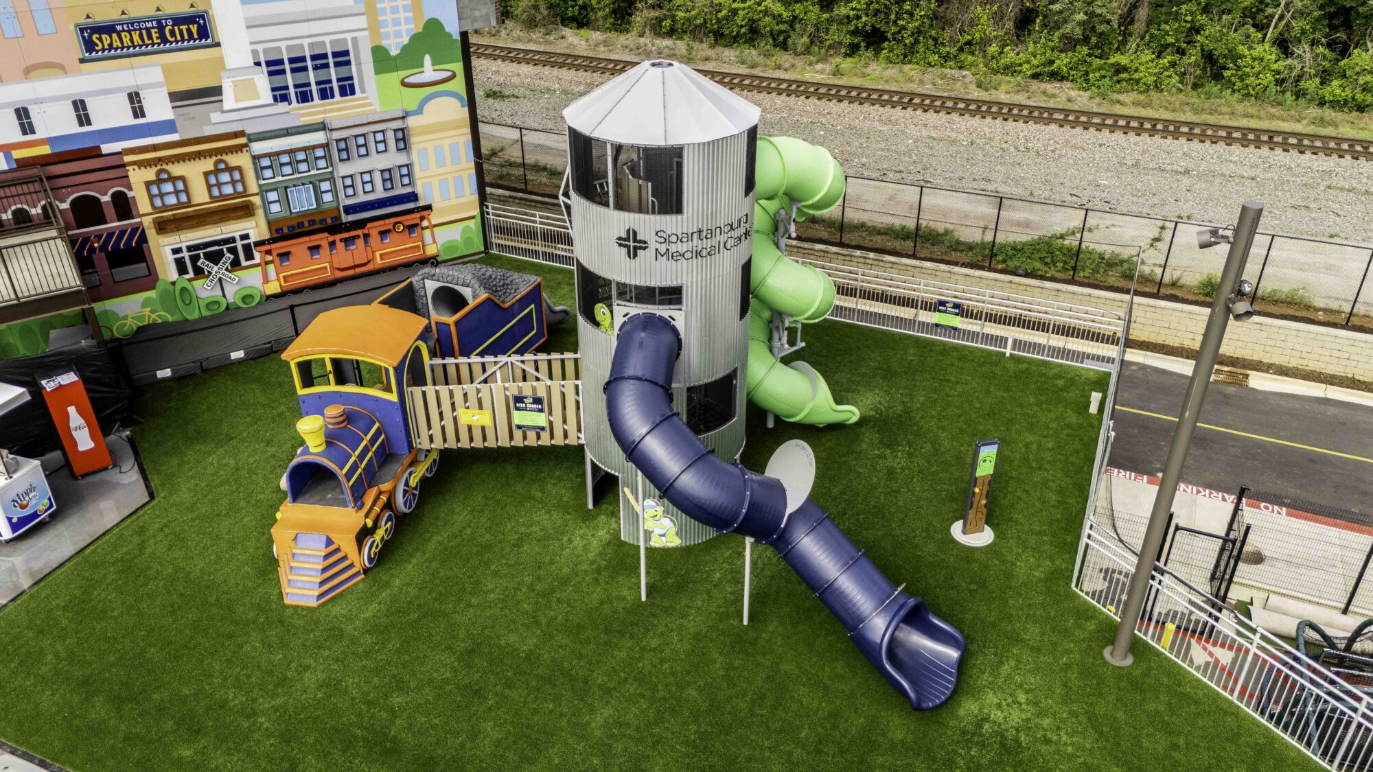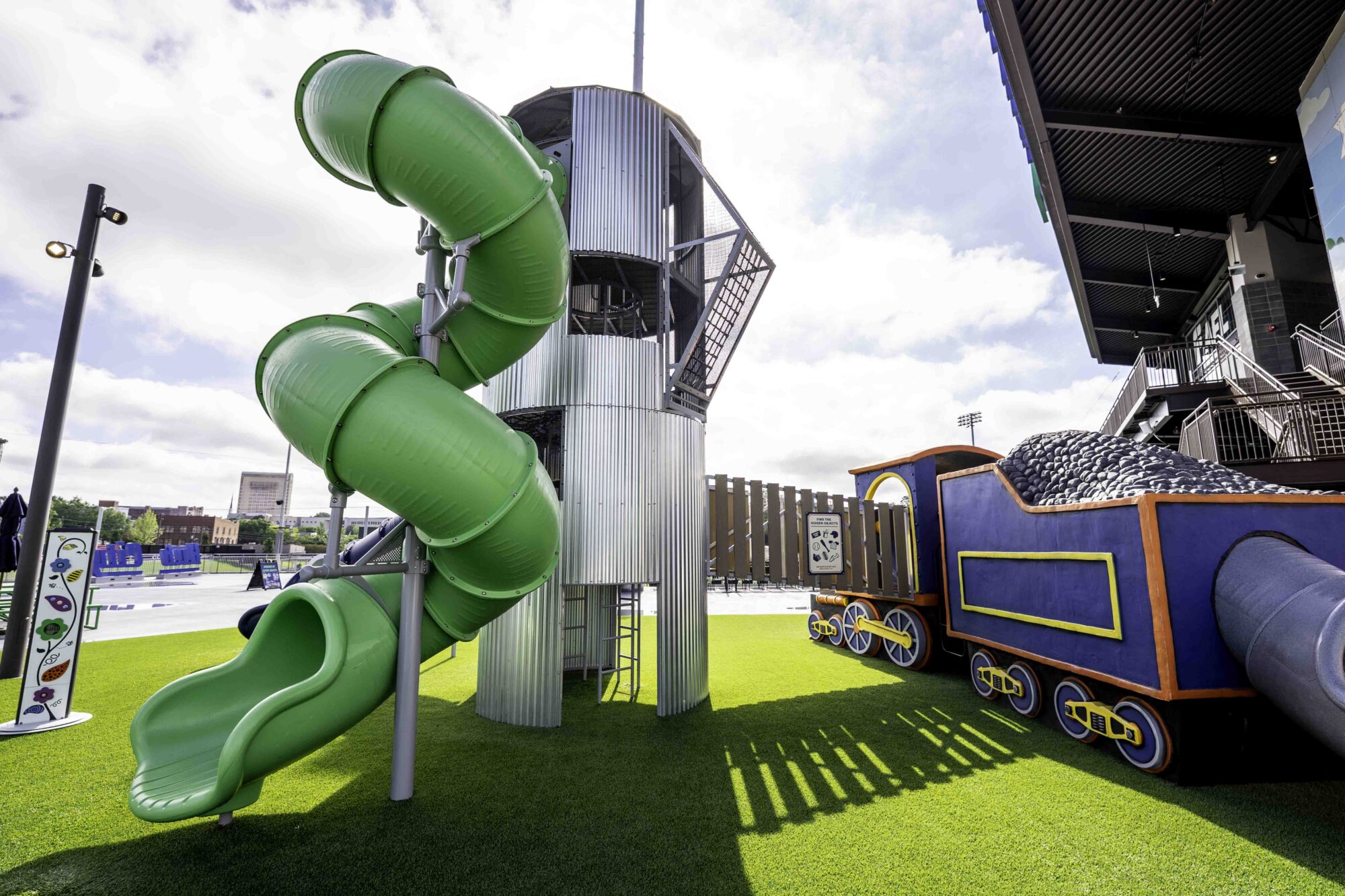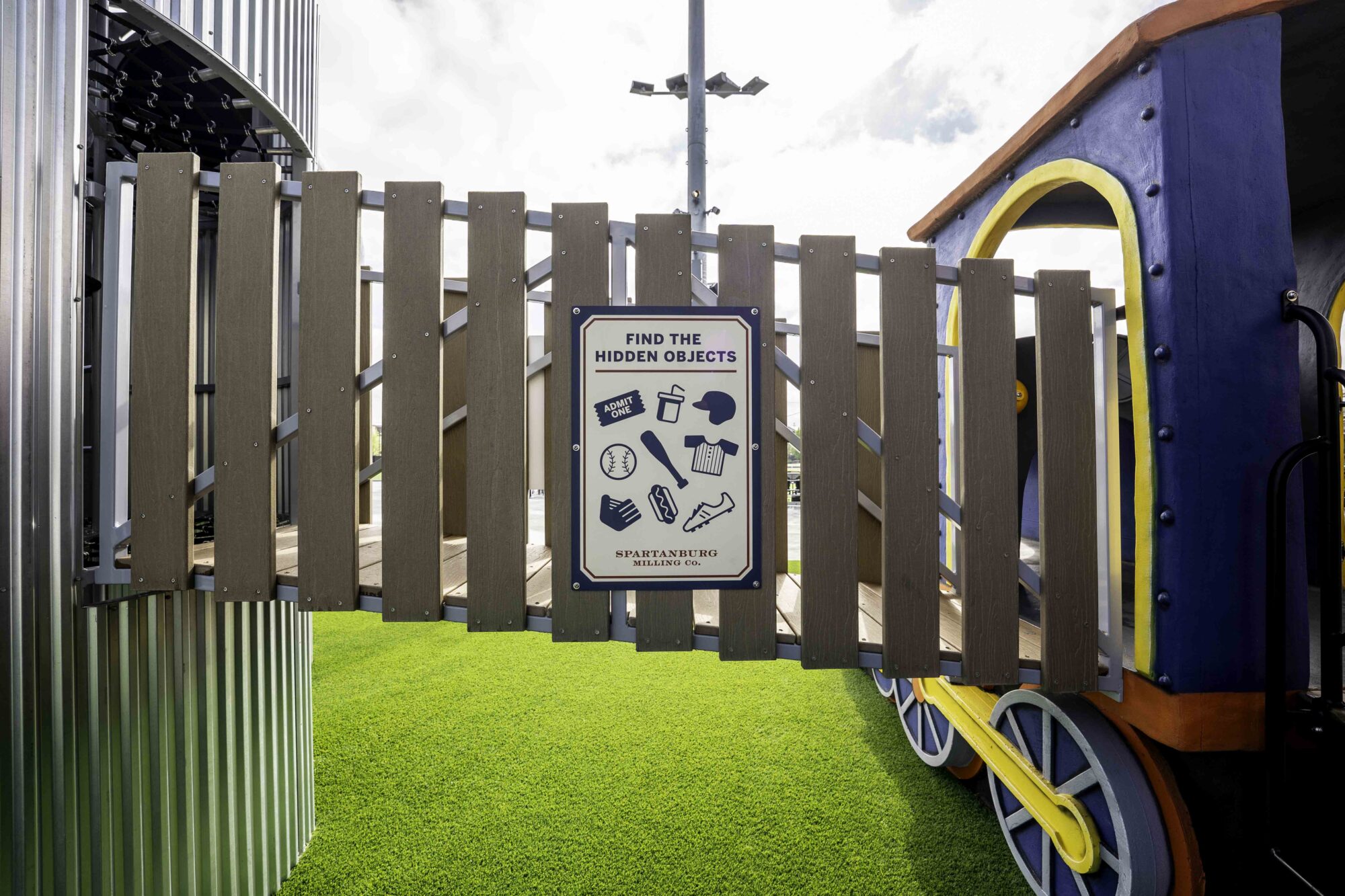 A one-of-a-kind playground designed and built for Fifth Third Park, home of Hub City Spartanburgers minor league baseball team! This immersive play environment celebrates Spartanburg, South Carolina’s agricultural industry, as well as its rich history as a major railroad hub. Baseball fans will also learn about the history of the town they love as they climb onto the train from multiple access points and slide down the coal bunker. They can also take a fun bridge from the train to the silo where they’ll find a challenging vortex rope climb to a 30 degree look-out window and twisty slide at the top! And if that wasn’t enough, they’ll have fun with multiple interactive games including, you guessed it, a baseball themed scavenger hunt! ⚾️