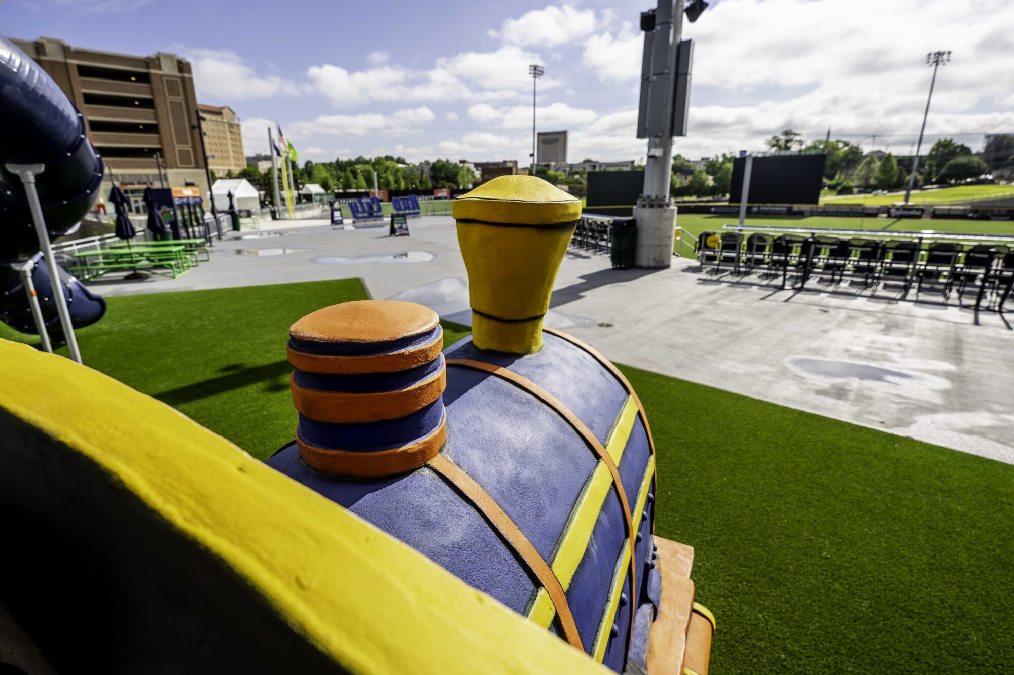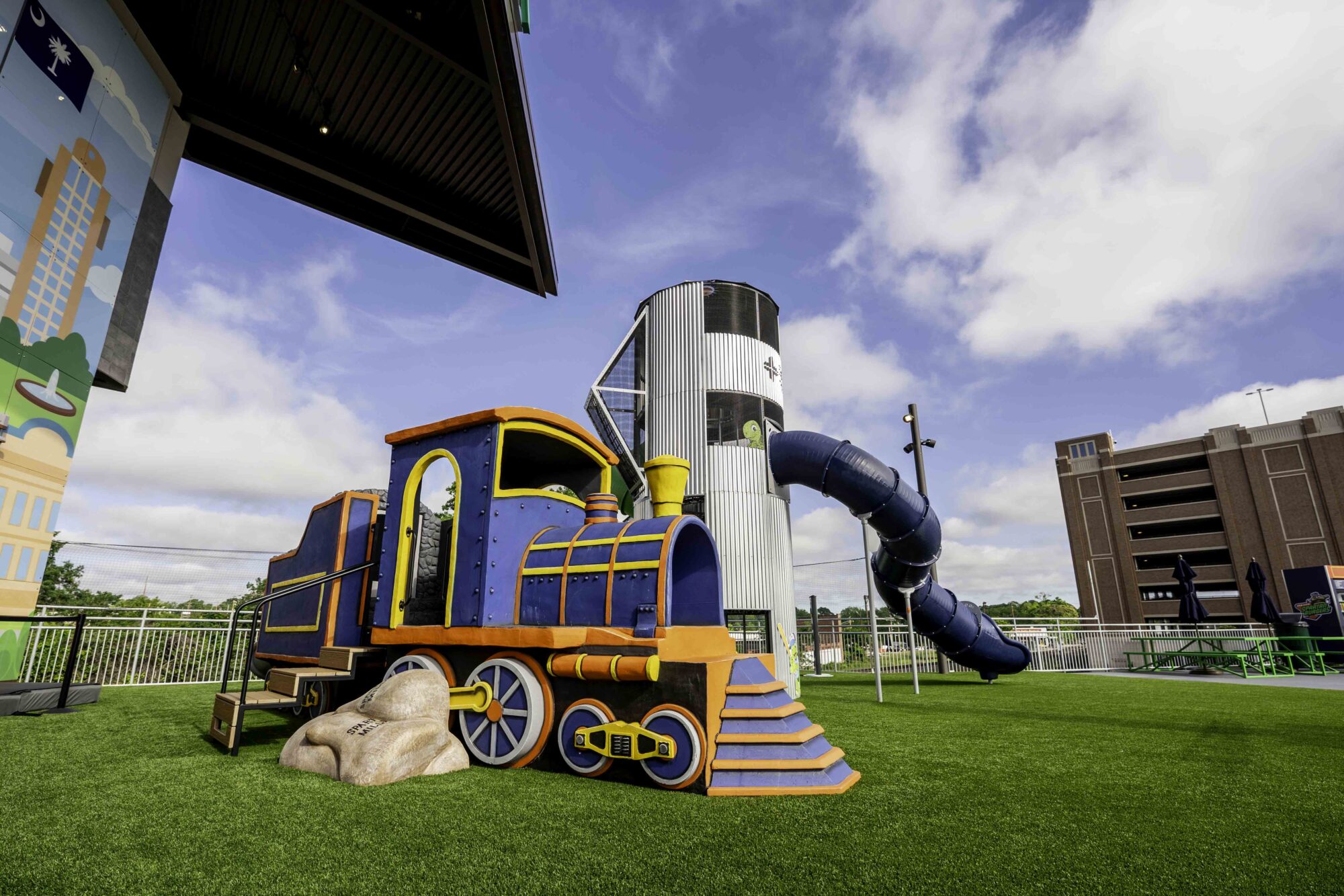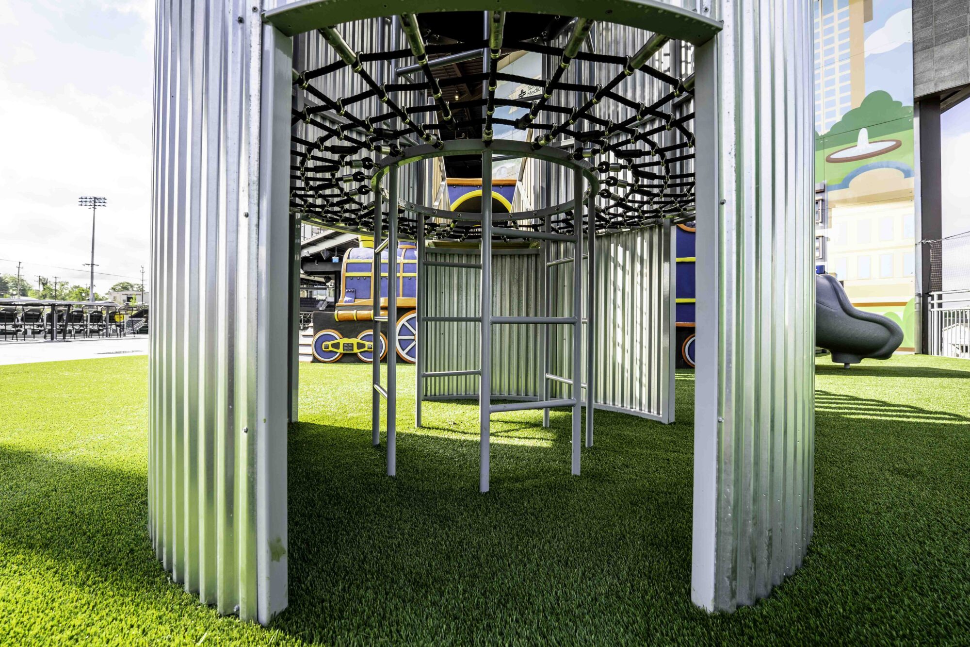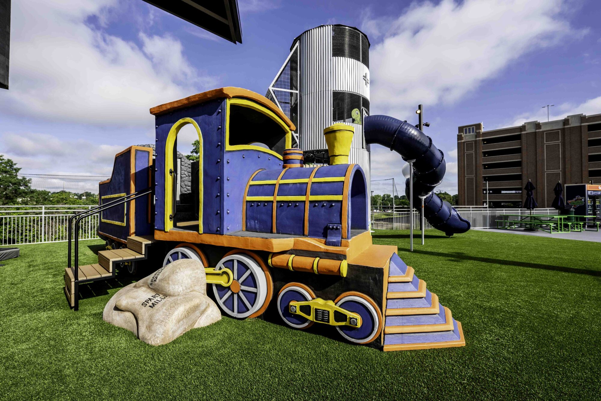 A one-of-a-kind playground designed and built for Fifth Third Park, home of Hub City Spartanburgers minor league baseball team! This immersive play environment celebrates Spartanburg, South Carolina’s agricultural industry, as well as its rich history as a major railroad hub. Baseball fans will also learn about the history of the town they love as they climb onto the train from multiple access points and slide down the coal bunker. They can also take a fun bridge from the train to the silo where they’ll find a challenging vortex rope climb to a 30 degree look-out window and twisty slide at the top! And if that wasn’t enough, they’ll have fun with multiple interactive games including, you guessed it, a baseball themed scavenger hunt! ⚾️