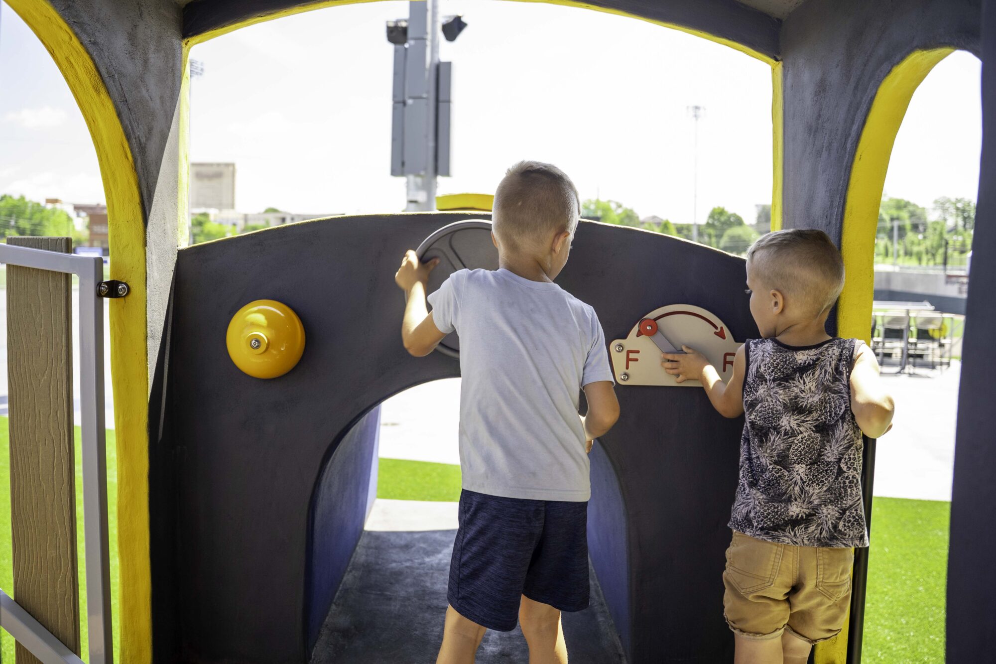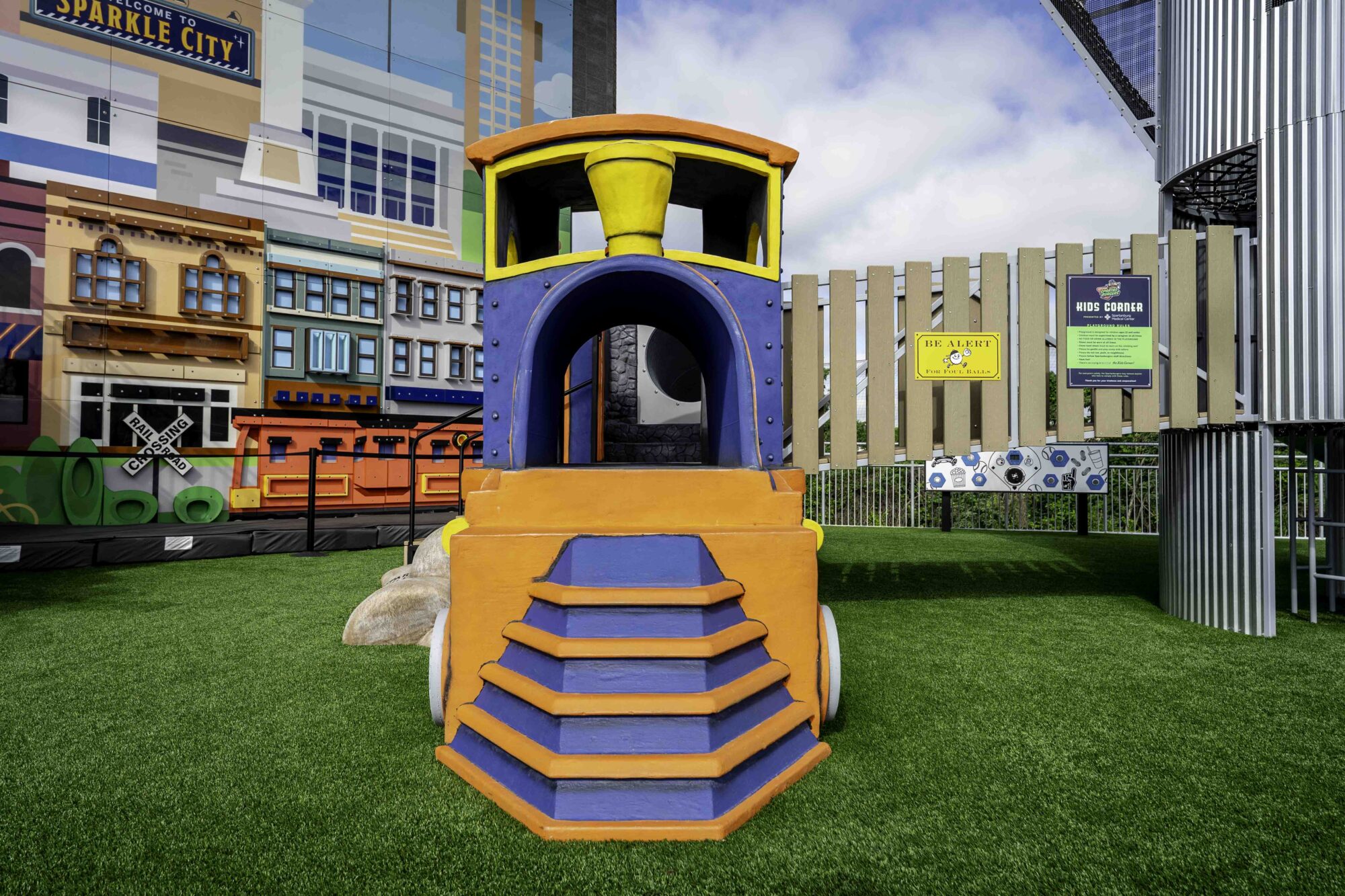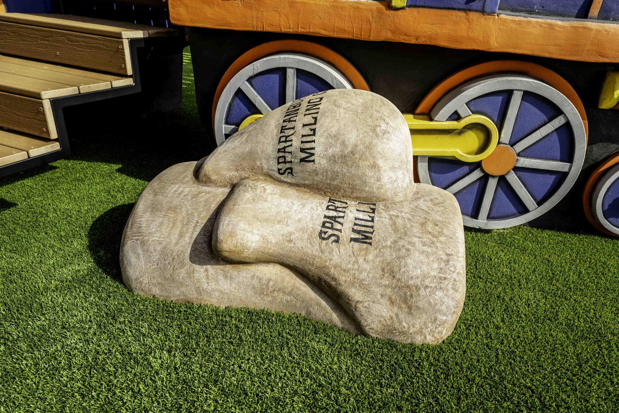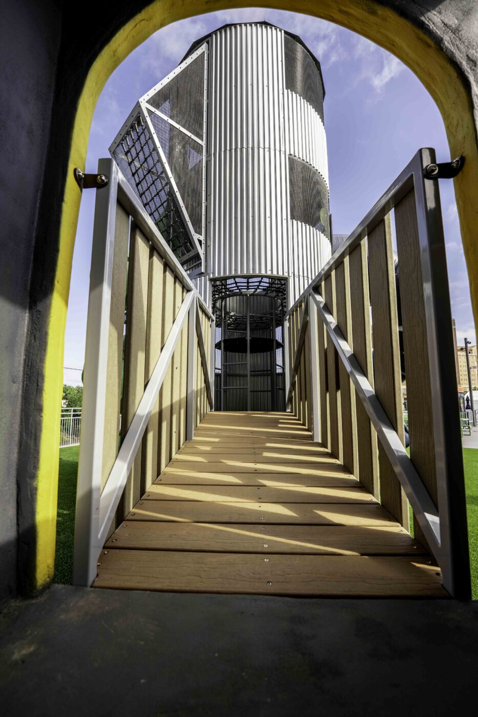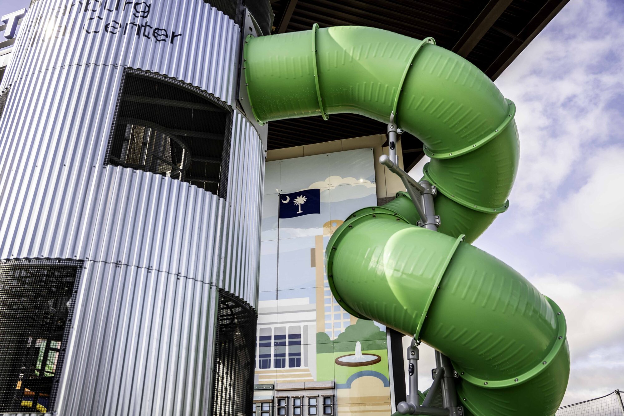 A one-of-a-kind playground designed and built for Fifth Third Park, home of Hub City Spartanburgers minor league baseball team! This immersive play environment celebrates Spartanburg, South Carolina’s agricultural industry, as well as its rich history as a major railroad hub. Baseball fans will also learn about the history of the town they love as they climb onto the train from multiple access points and slide down the coal bunker. They can also take a fun bridge from the train to the silo where they’ll find a challenging vortex rope climb to a 30 degree look-out window and twisty slide at the top! And if that wasn’t enough, they’ll have fun with multiple interactive games including, you guessed it, a baseball themed scavenger hunt! ⚾️
