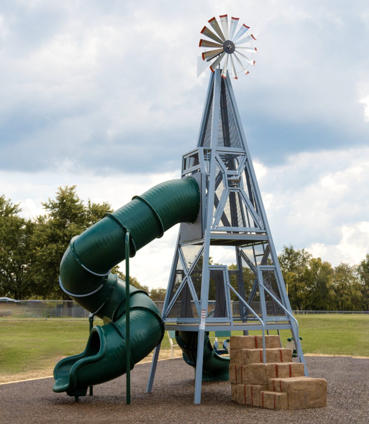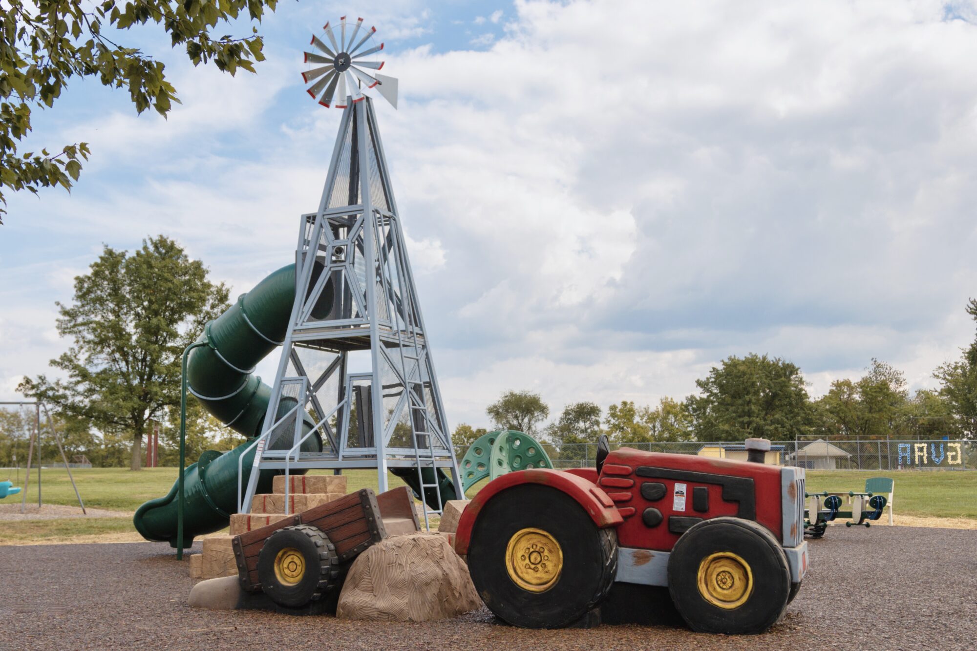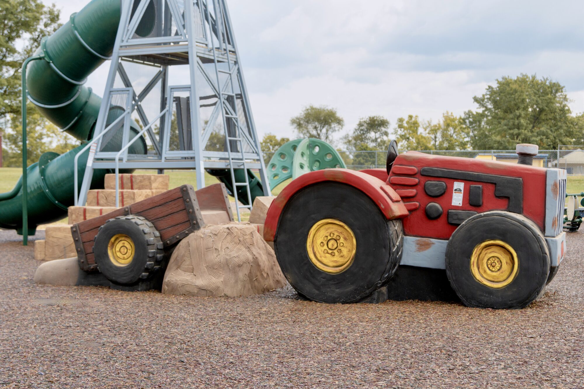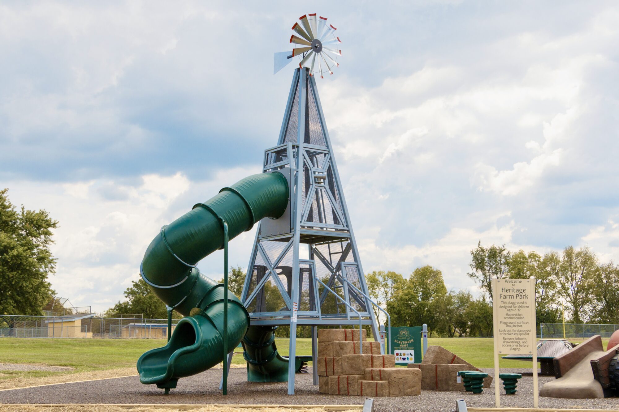 Heritage Farm Park in Walkersville, MD is the new home to a fresh-ON-the-farm play environment! This multigenerational and inclusive play environment features several products, including the Windmill Tower Wagon Climber, Tractor Climber, and Hay Bale Stack Climber.