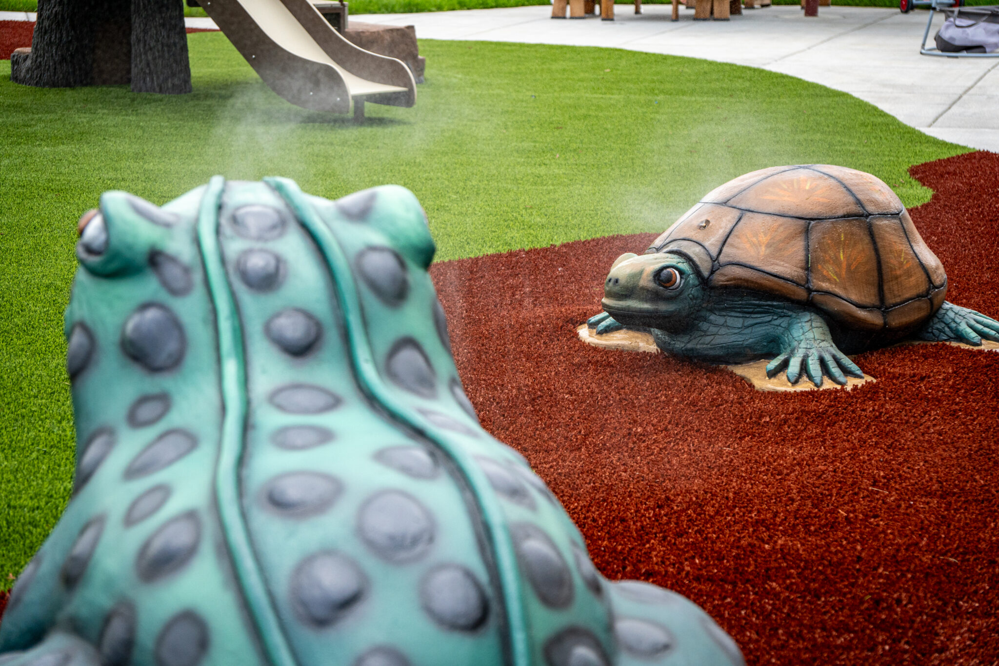 Kids LOVE to go to preschool at New Horizon Academy in Corcoran, MN! This play environment features a ton of Product including the New Horizon play system, the Frog Climber, Ladybug Stepper, Log Mound Tunnel, Slide Mound, Garden Stage and so much more! The Frog Climber, Turtle Climber and Ladybug Stepper at this particular location feature easy-connect misters for those hot summer days. Products are arranged in a way as to encourage movement throughout, and to immerse children into a world of exploration and discovery. Materials and components are selected for their ability to withstand extreme environments.