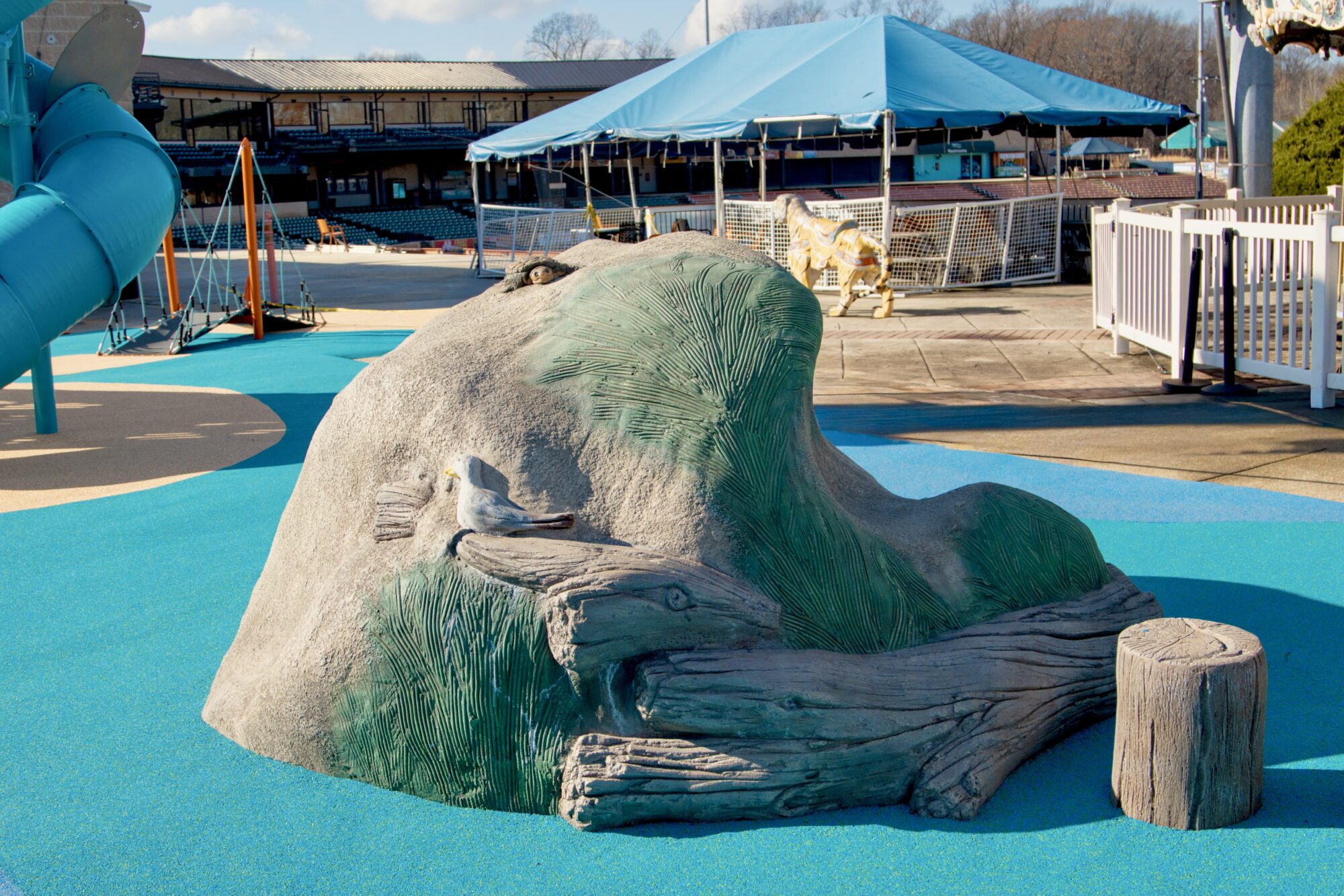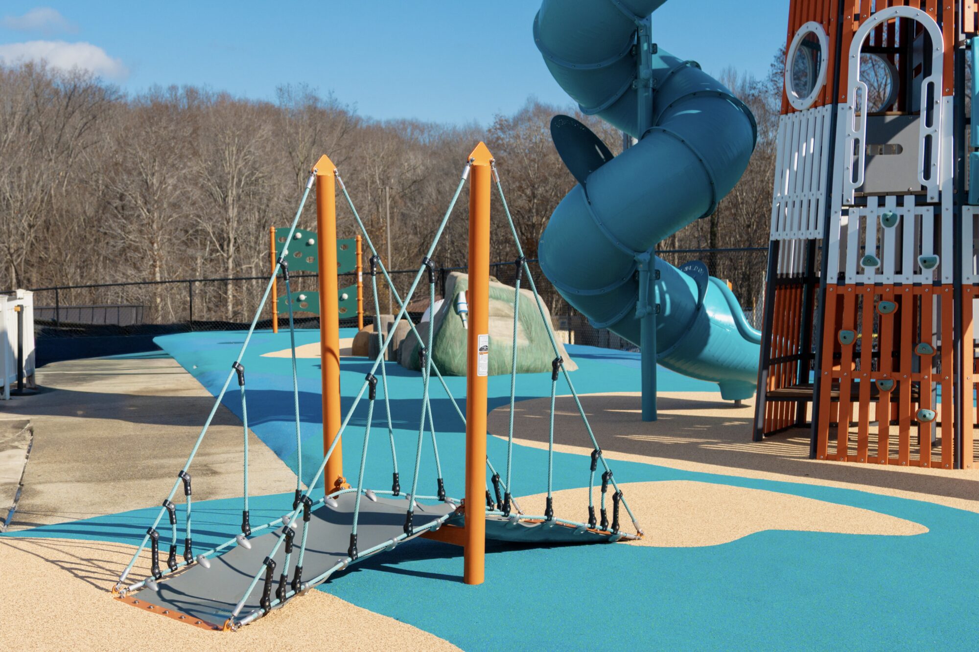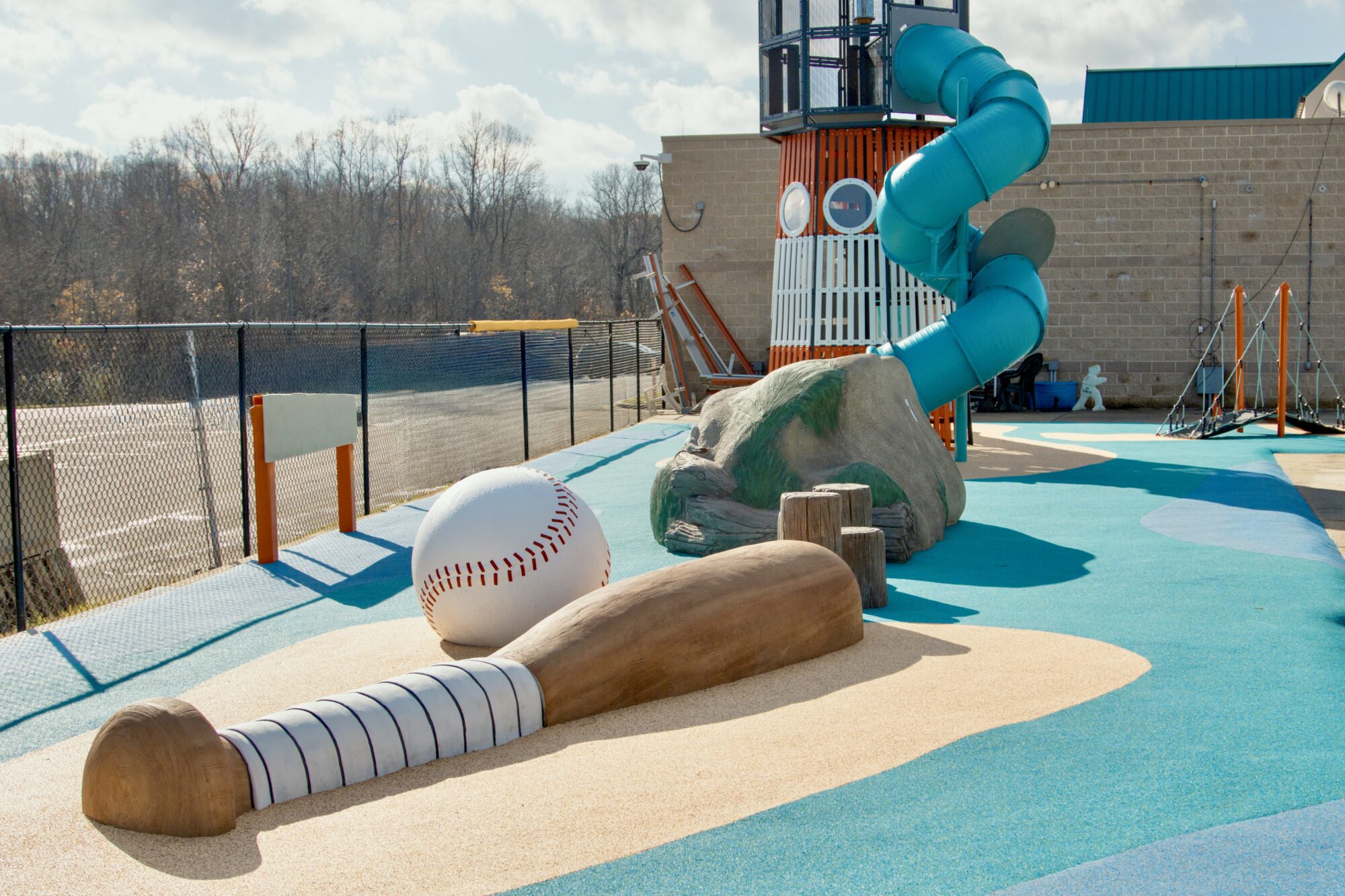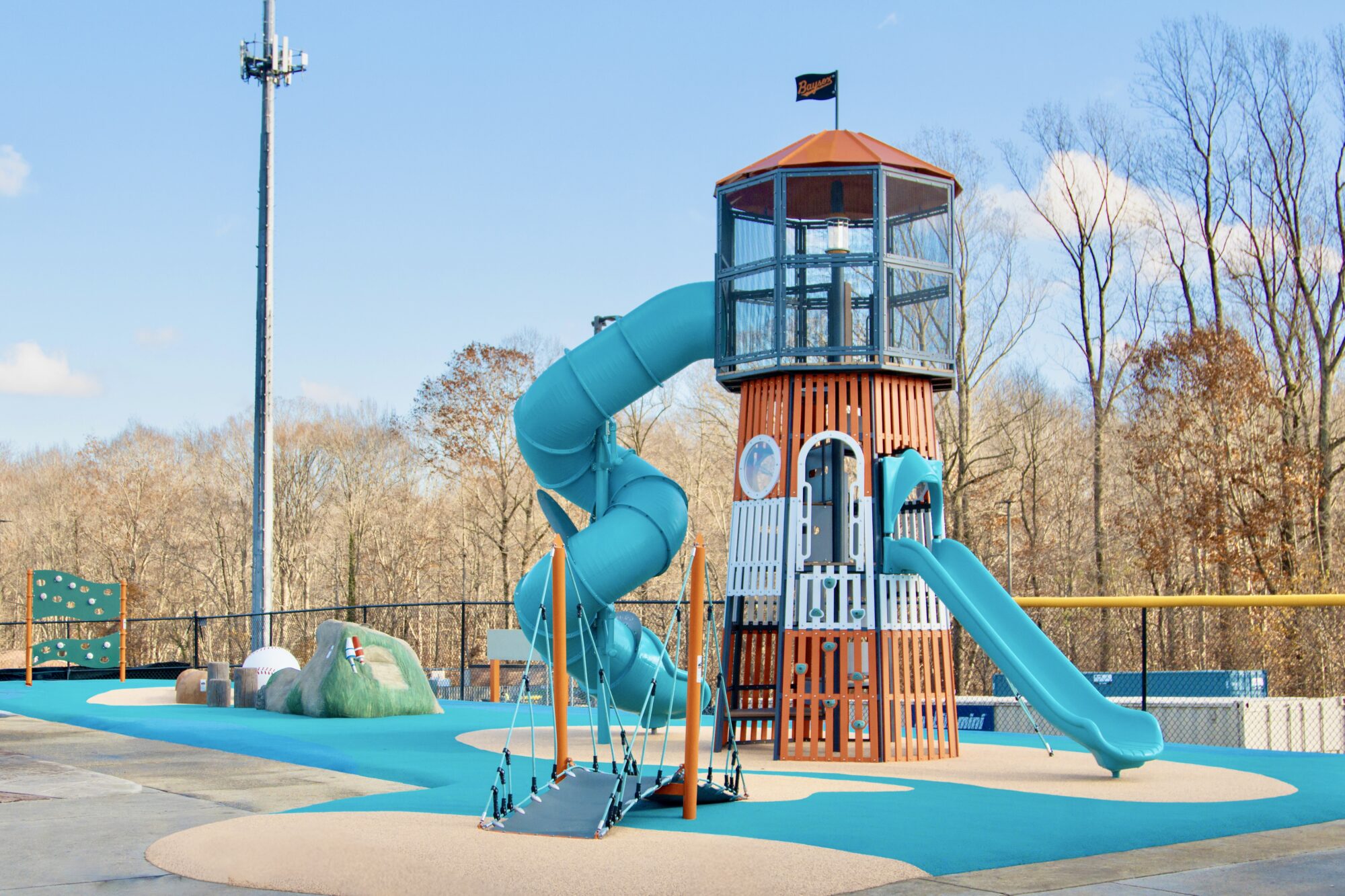 At Prince George’s Stadium, baseball-themed climbers honor the home team while a custom lighthouse honors the region’s rich maritime history. Climbers vary in challenge levels, so there is something for everyone! Take the bridge across the water to get to the lighthouse, which is loaded with interactive fun all the way to the lantern room. The sand dune climber features several fun finds, including a sea turtle, buoys, a seagull, and more.