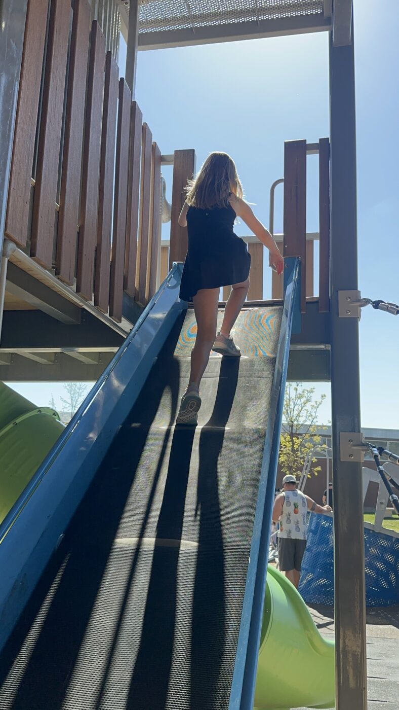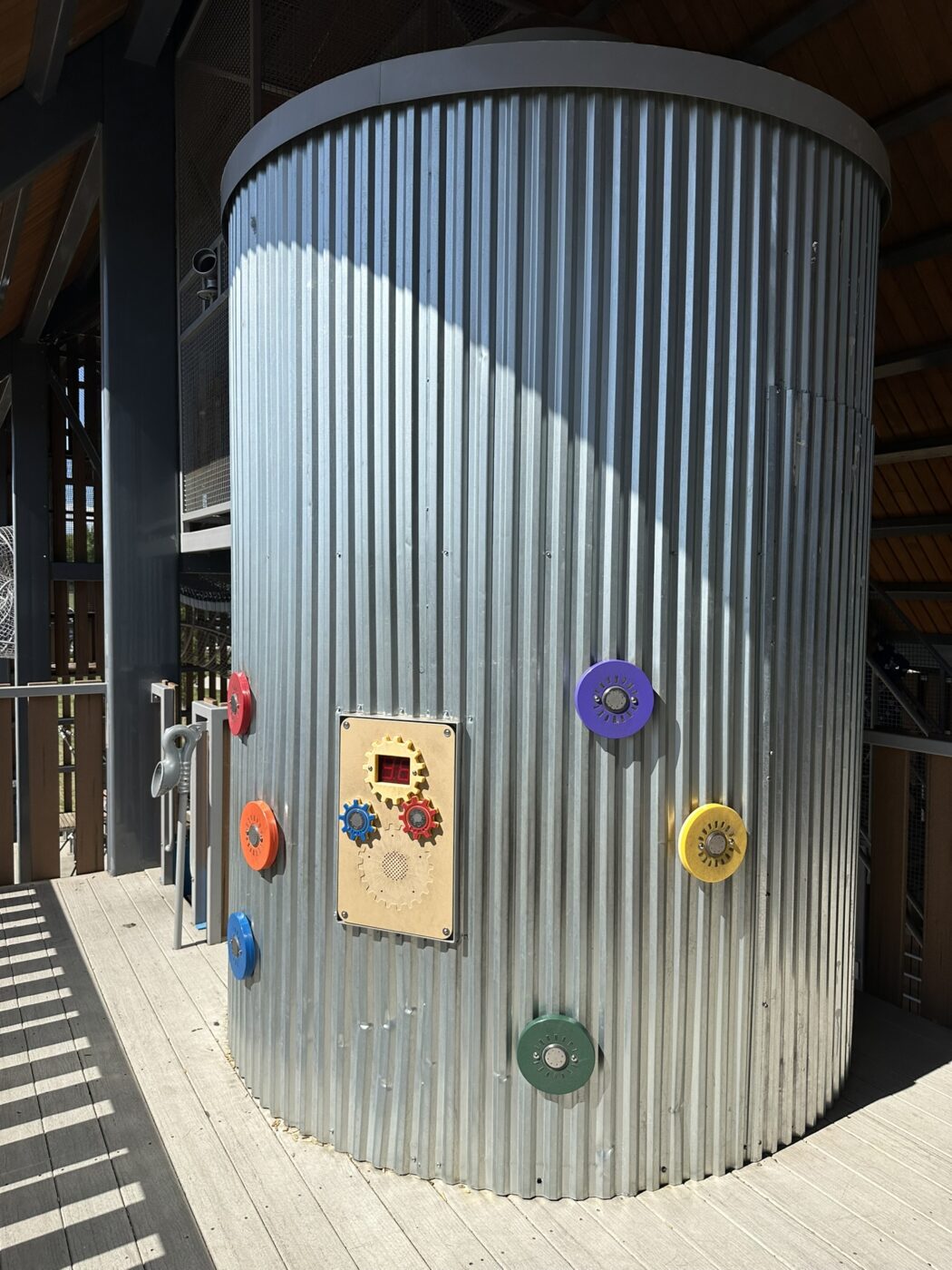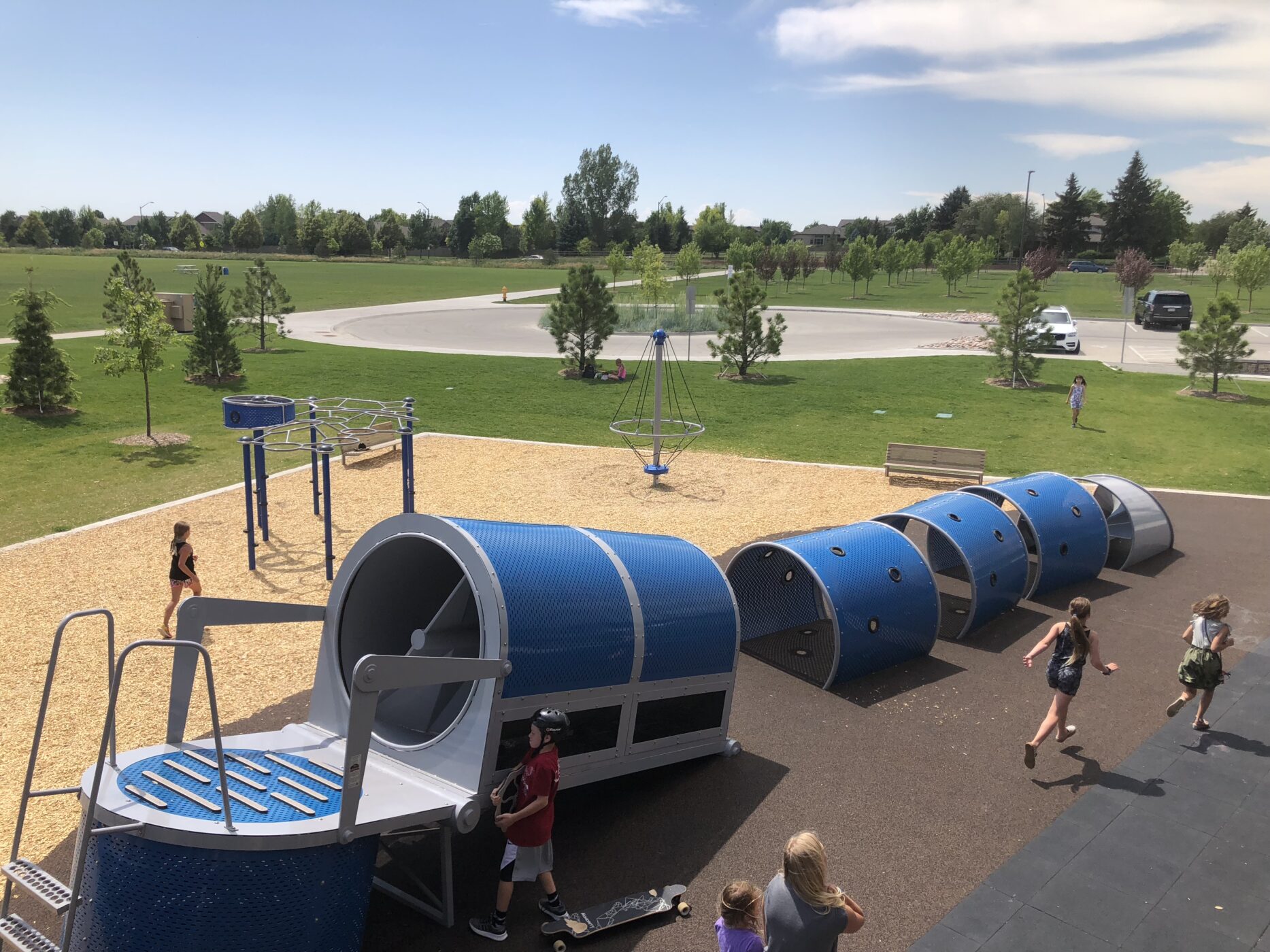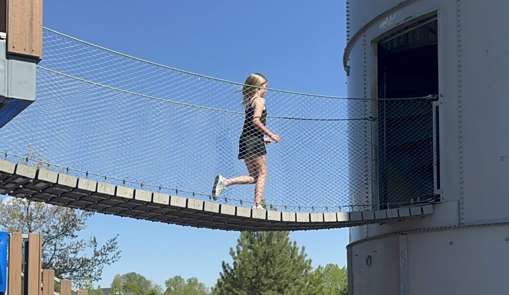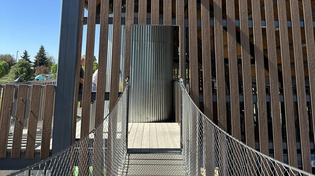 The focal point of the park is two renovated 51′ silos. Fitted with a spiral staircase, slide entrance, and more, the first silo offers a one-of-a-kind style of play. Regular stairs would be far to common– so to get to the top of the silo, there is a double-helix climber that offers two ways to climb to the top- both with a different challenge. At the top of the slide are red and green lights to alert when it is best to slide. Within this tallest slide in Fort Collins are even more fun gadgets. Funny and entertaining sound effects play as the child moves down the slide. They range from a sonic blast to a toilet flushing! The slide begins in one silo and after two full spirals, brings the rider into the second silo where there are zip lines leading to another area of the park.