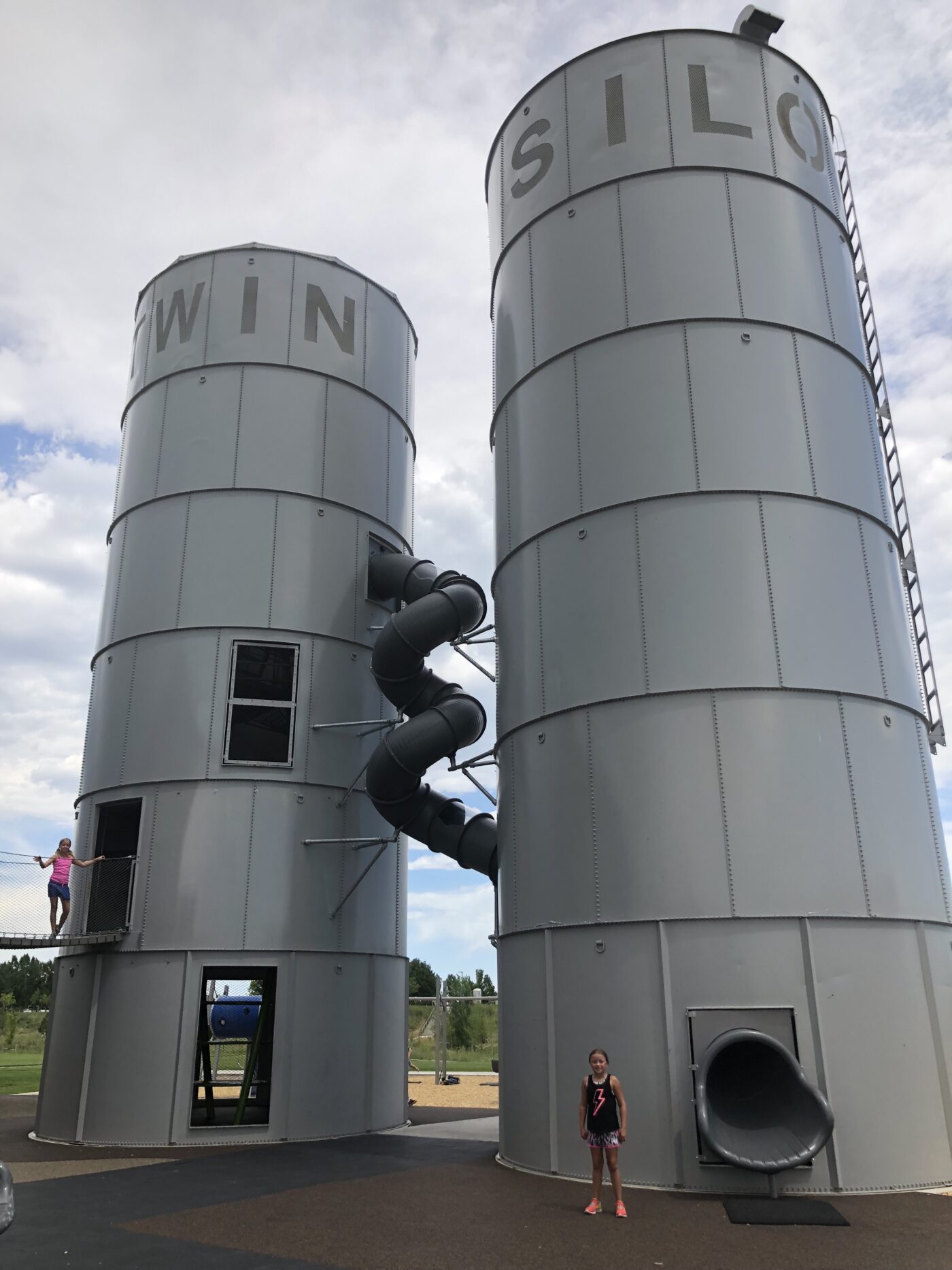 The park is lit for nighttime play. The words TWIN SILO are cut out of the tops of the silos and are fitted with LED lights that change color. Creative, original and interactive fun makes Twin Silo Park unique. Check out the video.